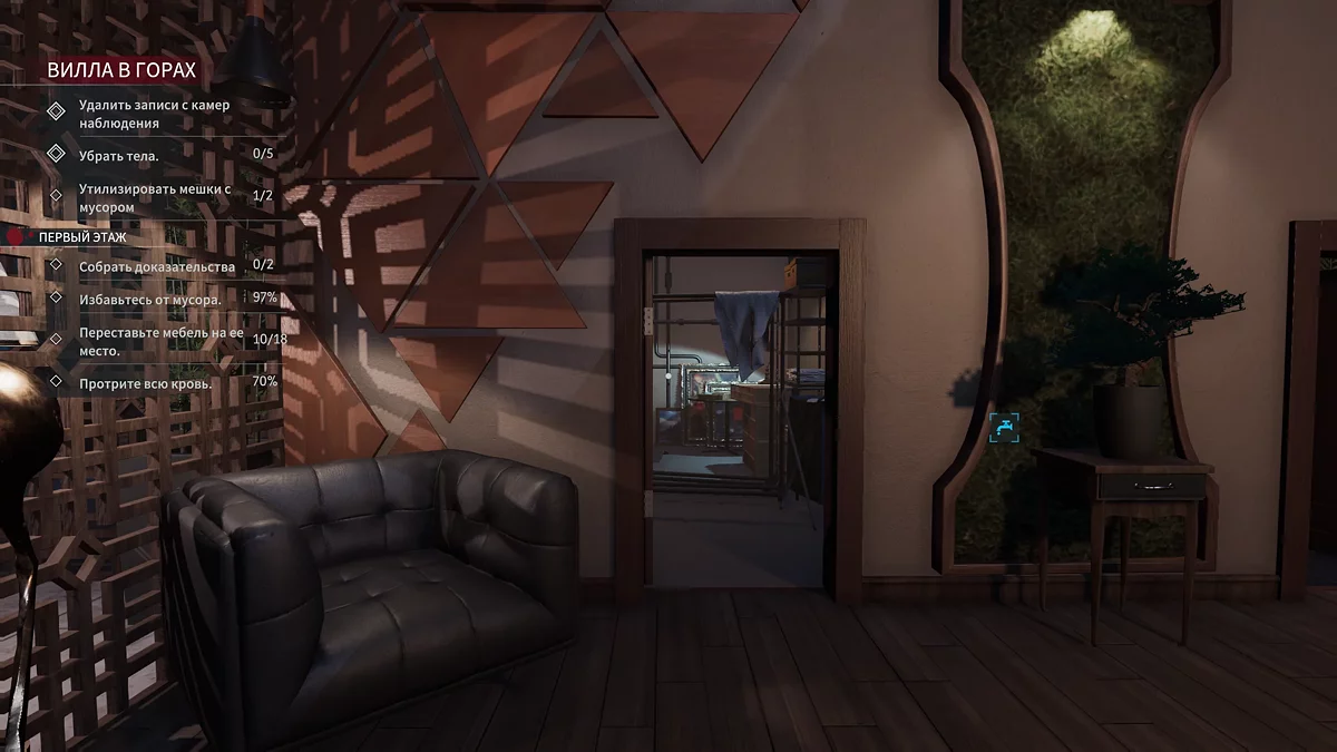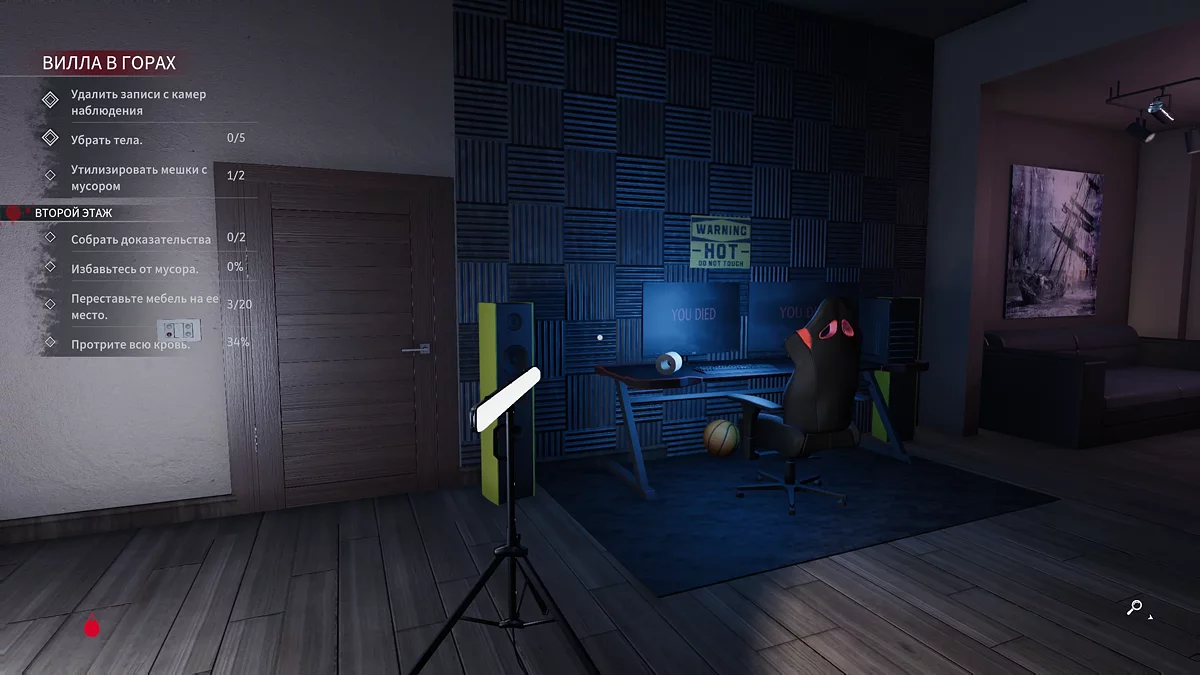 Перед второй комнатой будет улика № 9 — телефон дочери. Сломайте дверь топором и начинайте уборку. Справа нужно поднять стол, на котором должна стоять фигурка пегаса. Рядом поставьте белый стул. Слева от кровати на полу лежит улика № 10 — топор. Не открывайте балкон, пока не закончите уборку в комнате, чтобы следить за прогрессом. На белом столе подберите кассету № 3 — LULU Suicide. Расставьте всю мебель на свои места и, открыв балкон, спускайтесь к бассейну за последней жертвой. Разбейте стол на мелкие детали, сложите в мусорное ведро и избавьтесь от следов. В конце нужно сделать несколько фотографий места. Маркерами вам отметят точку, где нужно достать камеру, а по синему прямоугольнику можно ориентироваться, что именно нужно сфотографировать.