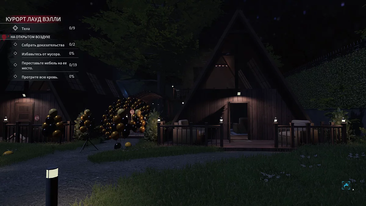 В комнате на столе будет улика № 6 — диктофон. В дальнем помещении будет ящик с кучей денег, спрятанный за картонными коробками. На второй этаж можно попасть через лестницу на дереве, с внешней стороны амбара. Закончив с очисткой домиков, можно направляться к бассейну. На лестнице будут две пивные бочки, которые нужно поставить у стены, к остальным. Третья бочка будет в траве, недалеко от костра. Четвёртая — между двумя домиками возле арки из шаров.
