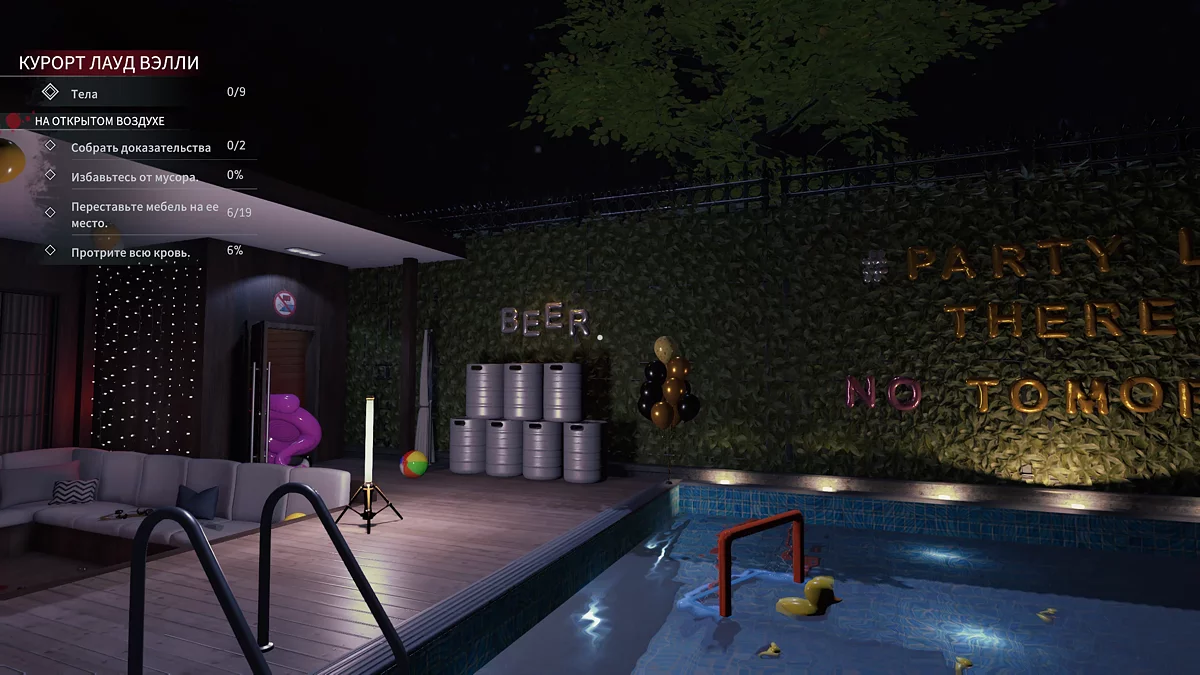 В бассейне нужно отмыть кровь и забрать стул, после чего включить насос в комнате управления, слева от пивных бочек. Стул должен быть у стола, в углу бассейна. Лишние надувные игрушки можно скинуть в воду. Последний деревянный стул, который нужно поставить на веранду, расположен возле камина на улице.