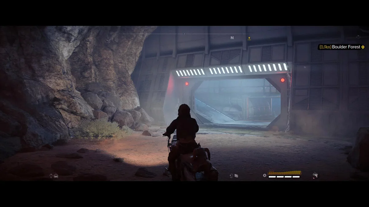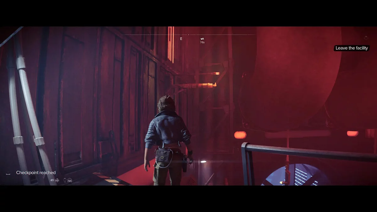 Теперь самое сложное. Когда вы приблизитесь к входу, пройдите под мостом перед вами, а не над ним. В противном случае вентилятор на мосту нанесет урон. Оказавшись под мостом, вы столкнетесь с энергетическим барьером, который вам нужно отключить.