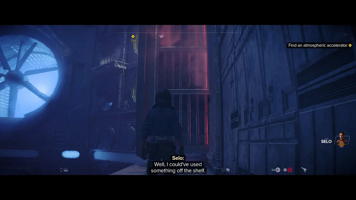 Прибыв на нужную точку маршрута, вы найдете магазин Село, где она будет сидеть снаружи у края обрыва. Взаимодействуйте с девушкой, чтобы запросить работу по улучшению вашего спидера, и она попросит вас найти специальную деталь, которая ей нужна для него — Атмосферный ускоритель (Atmospheric Accelerator). Она даст вам магнитные разрушители, которые скоро пригодятся.