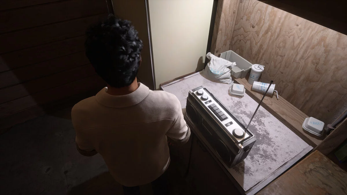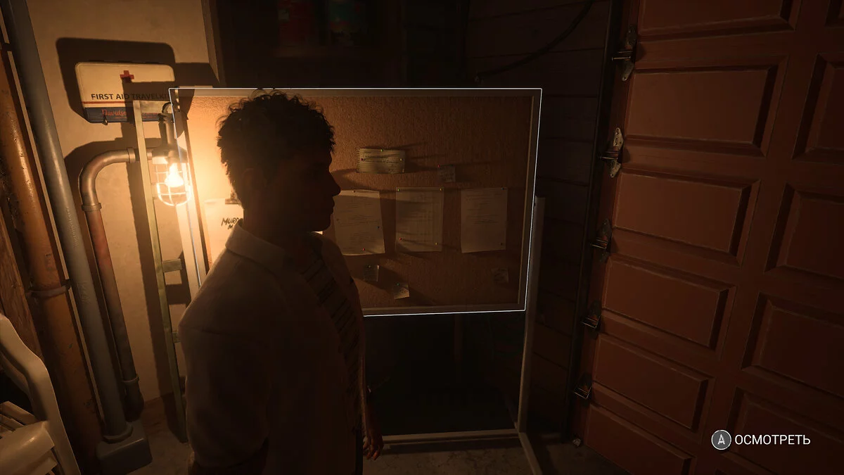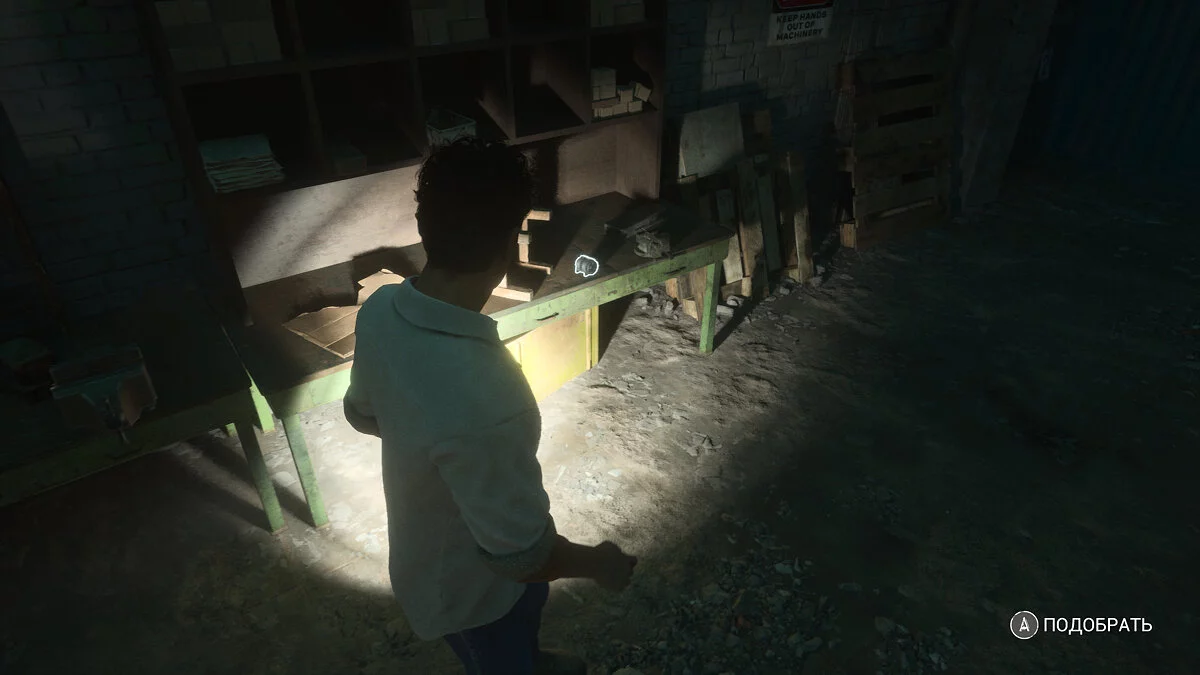 Внутри идите направо и протиснитесь между плитами. Идите через дверь. Справа на столе будет лист со временем прибытия работников завода. Напротив стоит серый шкафчик, который можно изучить. Упадет деревянный планшет с листом. Прочитайте улику.
