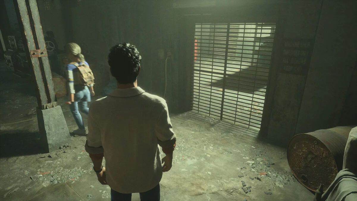 Возвращайтесь в основной коридор и пройдите до момента, когда слева будет лестница вниз. Спуститесь и пролезте через щель. Сразу же появится Крис. В нашем случае будет просто диалог, в котором Сэм уговорит девушку спрятаться. Если бы вы взяли у хозяйки магазина древностей зеркало, сцена была бы сложнее.