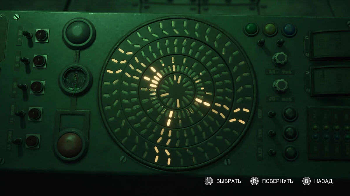 На пульте 4 окружности, образующих диск, но двигаются только 3 из них. Самый внешний стоит на месте — ориентируйтесь на него. На окружностях горят некоторые деления. Вам нужно совместить следующую окружность с неподвижной так, чтобы совпали подсвеченные деления. Не обращайте внимание на форму, вас интересует только расположение и количество. А вот два последних диска по количеству не совпадают. Тут принцип еще проще. Оцените где в каких зонах светящихся делений больше — совмещайте с теми, где их тоже больше. Все это на глаз без какой-либо логической системы. Большее к большему.