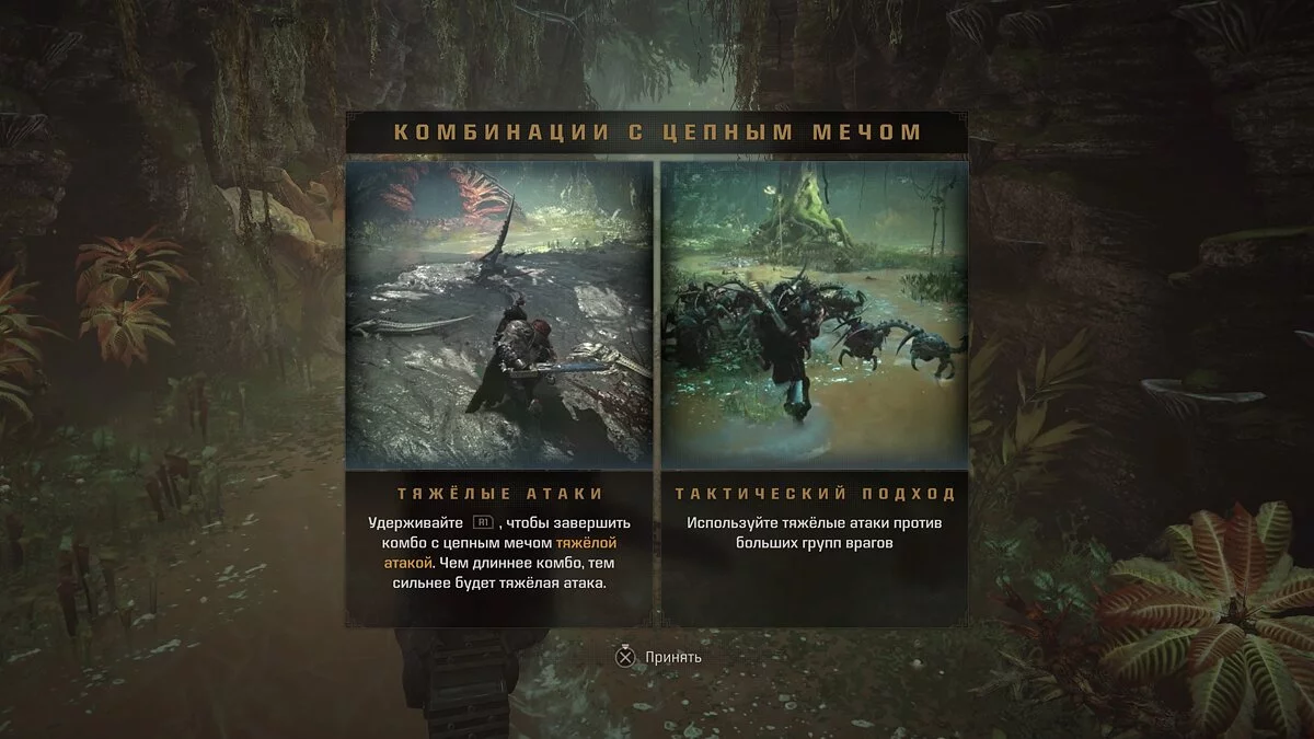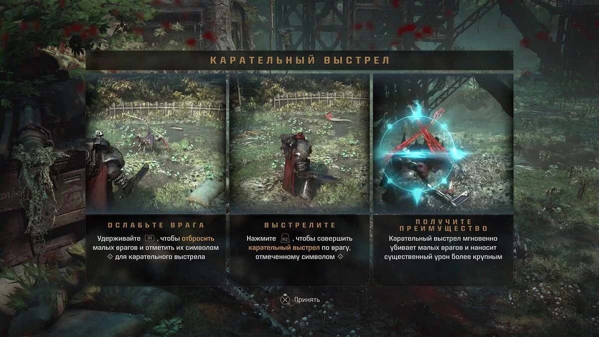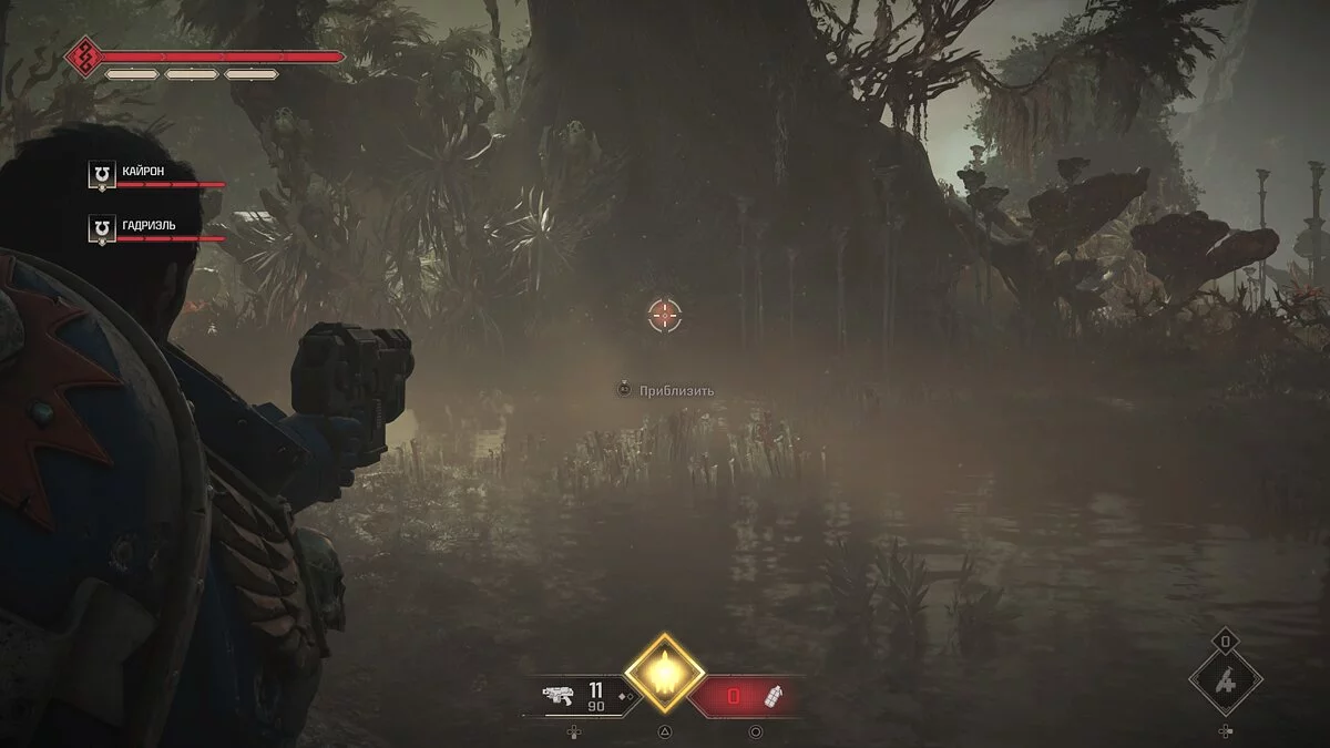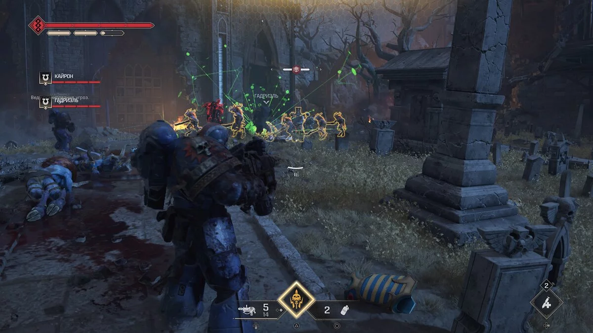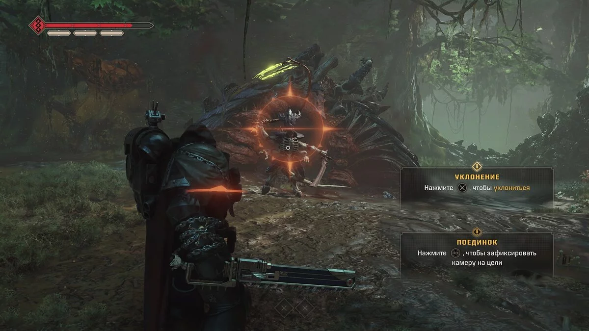 Вас ждёт сложный бой, ведь, помимо рядовых ксеносов, будут два усиленных монстра. Главное вовремя парировать их атаки и бить серией ударов в ответ. Можете полагаться на комбо с участием огнестрела, о котором мы рассказали выше. Затем на вашего героя нападёт враг с повышенной защитой. Её можно пробить усиленным ударом мечом, который активируется зажатой клавишей R1. После этого проводите серию простых выпадов и добивайте тиранида при помощи фаталити.