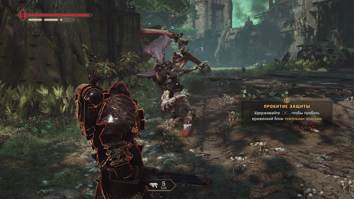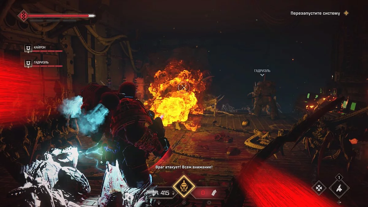 Как раз такой враг ждёт вас дальше. От ударов, которые отмечены красным кругом, нужно уклоняться при помощи кнопки X. Парируйте лёгкие атаки и бейте его серией ударов. Не забывайте завершать их зажатием клавиши R1. Когда противник упадёт без сил, устройте ему фаталити при помощи кнопки R3. Таким образом вы не только красиво добьёте тиранида, но и мгновенно восстановите броню.