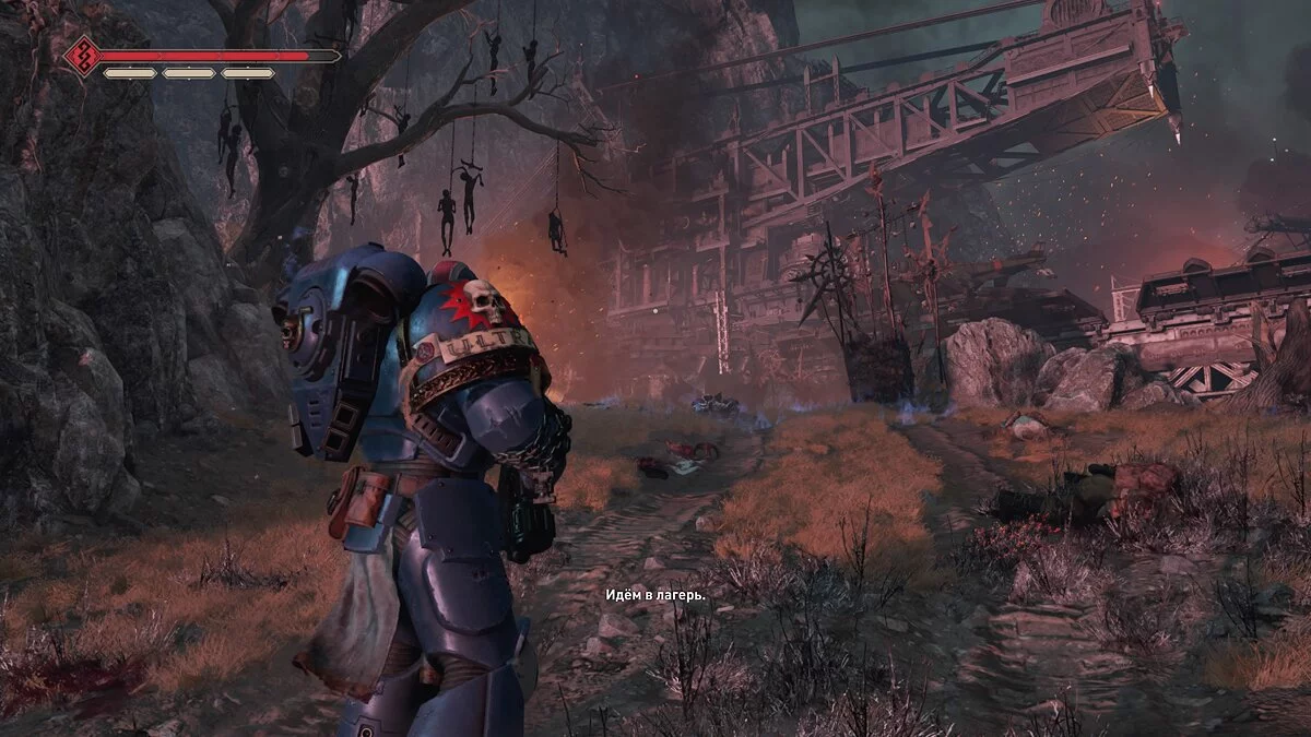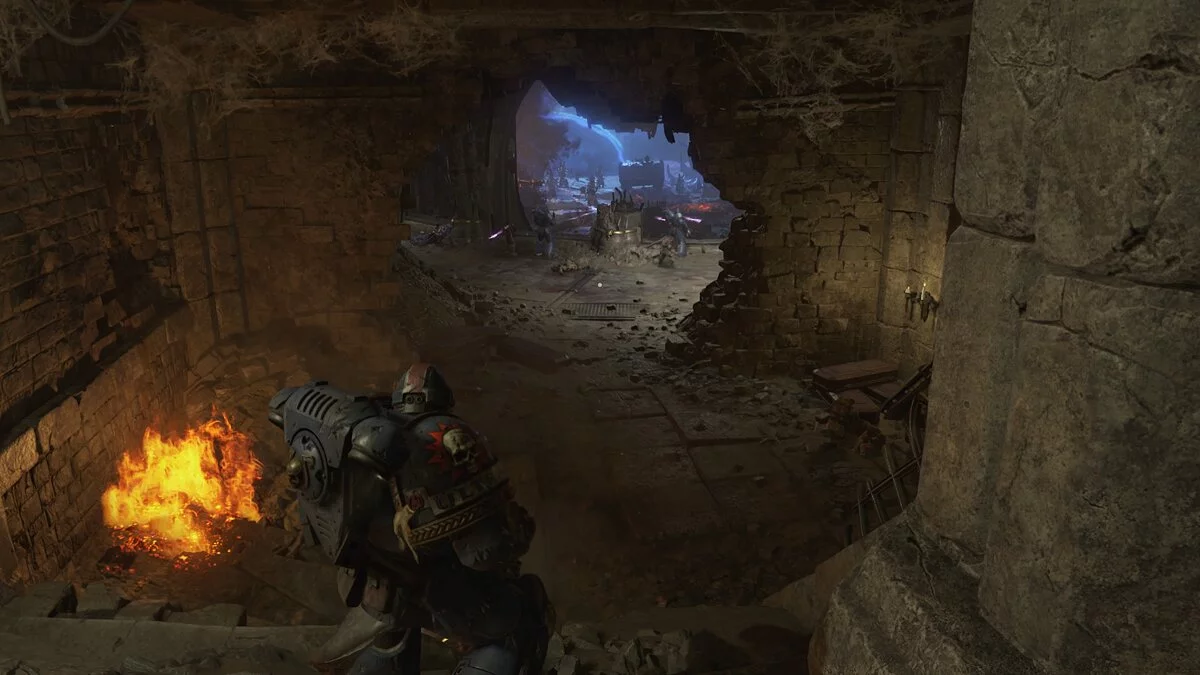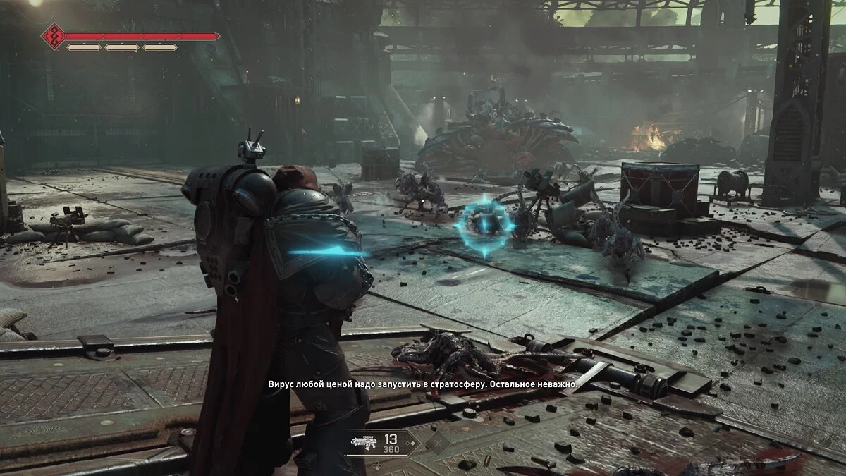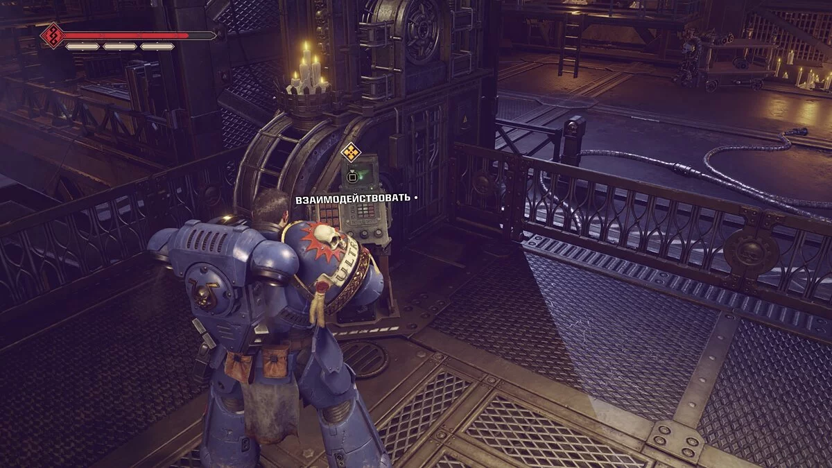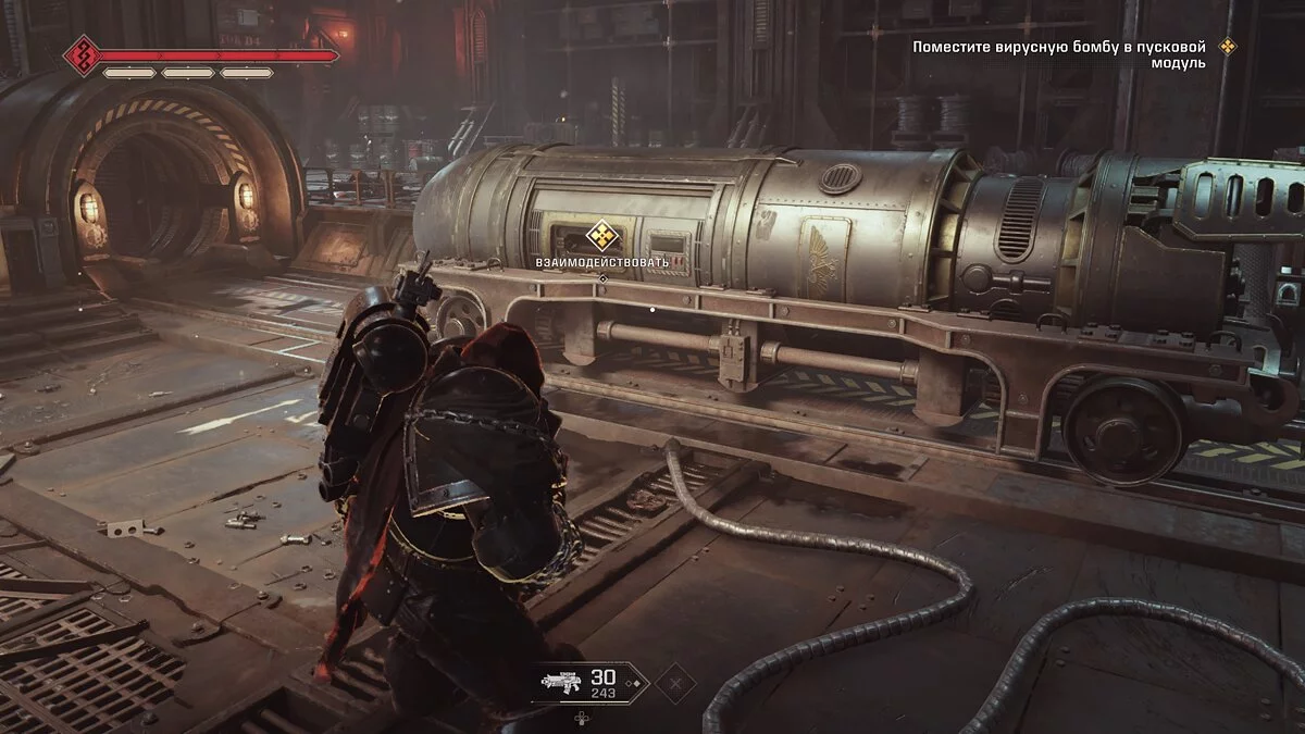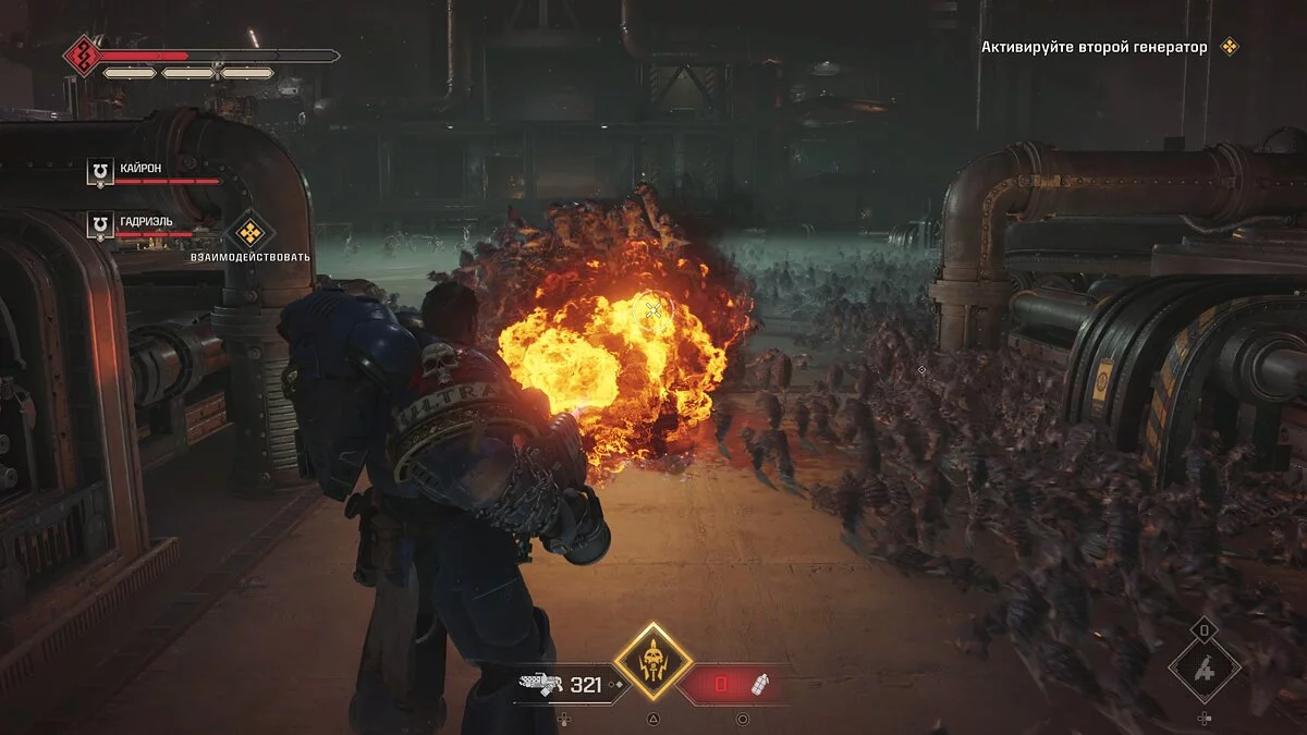С его помощью вы сможете пробиться через полчища мелких тиранидов. Они ведут себя примерно как крысы в A Plague Tale: Innocence. Эти ксеносы боятся вашего огнемёта и разбегаются по сторонам, но могут напасть сзади. От таких атак нужно уклоняться в сторону. Магос укажет точку, к которой нужно двигаться. Нажмите на кнопку и отбивайтесь от тиранид, пока восстанавливается питание. Когда прогресс достигнет 50%, на вас нападут крупные ксеносы. Они тоже уязвимы к огню, поэтому просто направляйте на них пламя пиробластера.