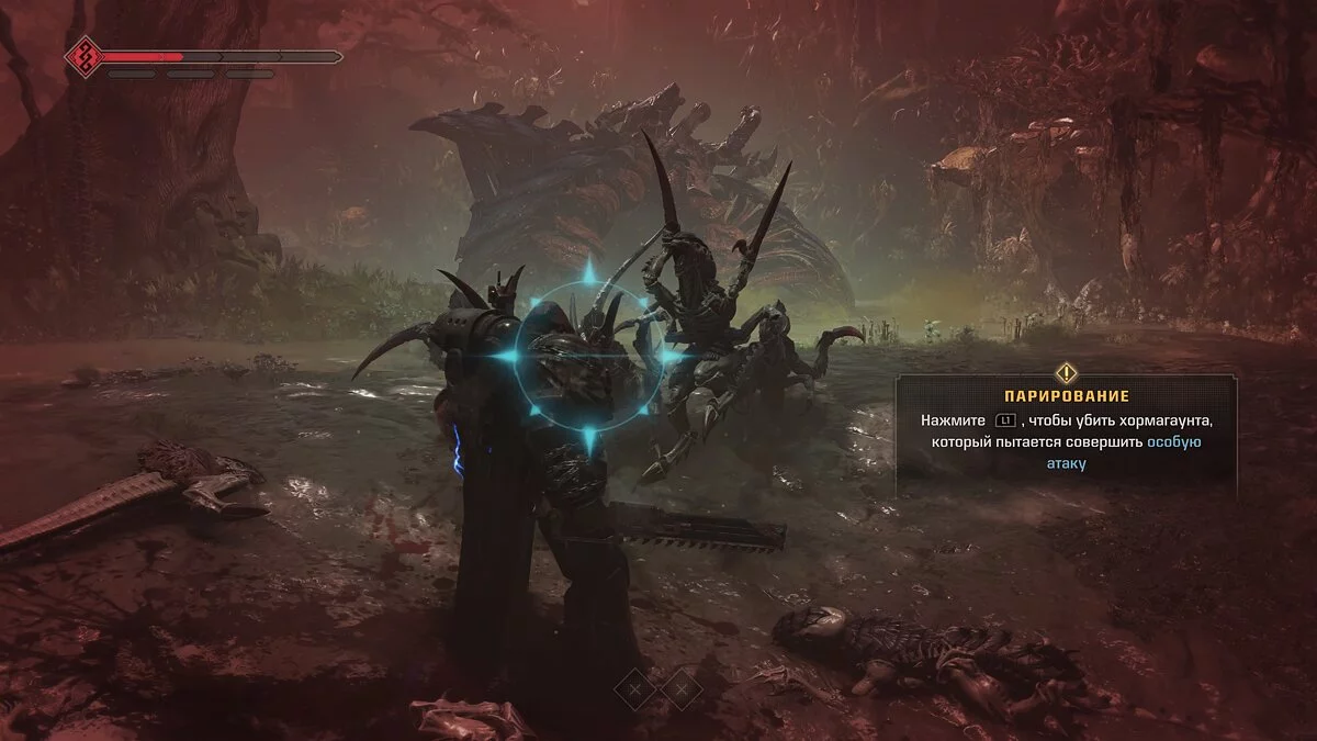 Двигайтесь дальше. Во время следующего сражения можете попробовать парировать вражеские удары. Для этого нажмите L1, когда увидите голубое свечение. Таким образом можно мгновенно убить слабого тиранида и ошеломить противника средних размеров.