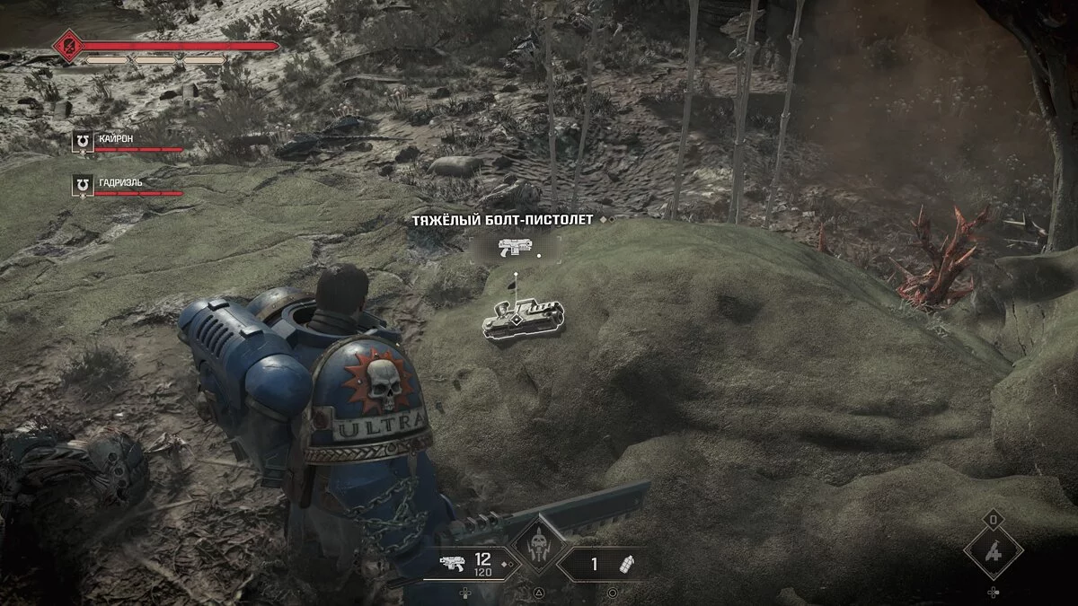 После кат-сцены подойдите к стойке с оружием, которая находится в центре небольшого болота. Заберите болт-пистолет и цепной меч. Пройдите вперёд, возьмите осколочные гранаты и спускайтесь к круглой площадке.
