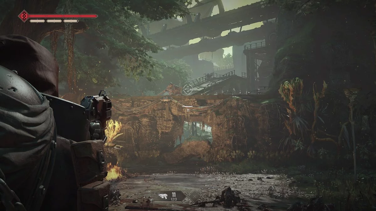 Одолейте равенера и двигайтесь вперёд. Обращайте внимания на уступы — на них находятся кислотные тираниды. Отстреливайте их с большой дистанции. Когда закончите, взаимодействуйте с цветком. За ним вы увидите споры, которые желательно уничтожать на расстоянии. Если не получилось и они полетели на вас — уклоняйтесь. Так вы сможете избежать урона. Рекомендуем не тратить на них патроны для винтовки, а обойтись пистолетом.