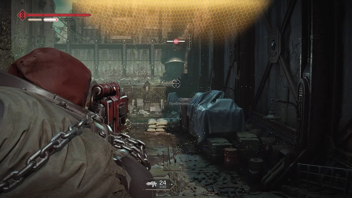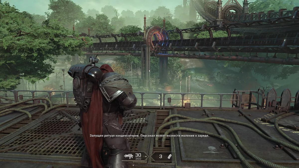 После победы над Ликтором взаимодействуйте с цветком, пополните запас боеприпасов и поднимитесь наверх, к разрушенной лаборатории. По пути можете подобрать болт-карабин «Окулус». Перед входом в нужное здание вас будет ждать снайпер. Но убивать его необязательно — достаточно забежать под крышу и перебить тех ксеносов, которые вступят с вами в ближний бой. После этого магос откроет дверь в исследовательский центр.