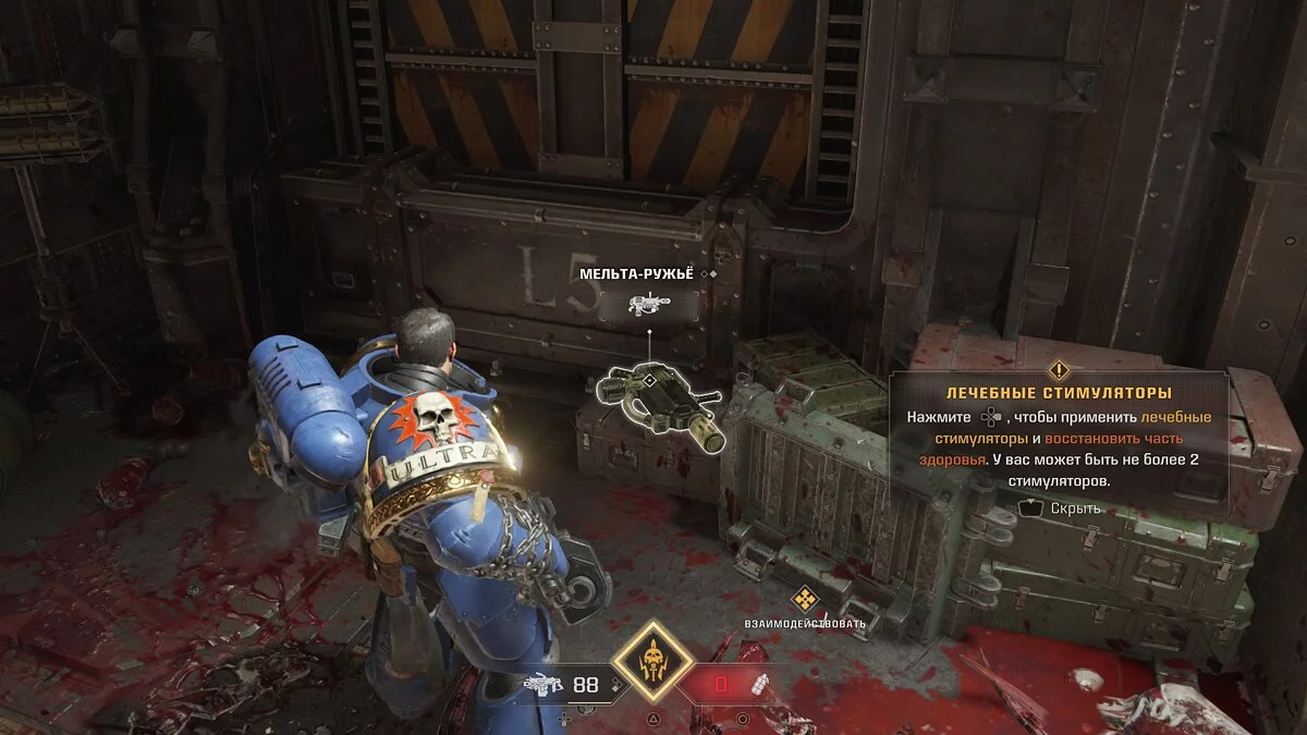 Когда окажетесь на месте жестокой битвы, загляните в правый угол помещения. Там вы найдёте лечебные стимуляторы и мельта-ружьё, футуристичный аналог дробовика. Оно крайне эффективно на ближней дистанции, ведь может одним выстрелом убить целую группу мелких противников.
