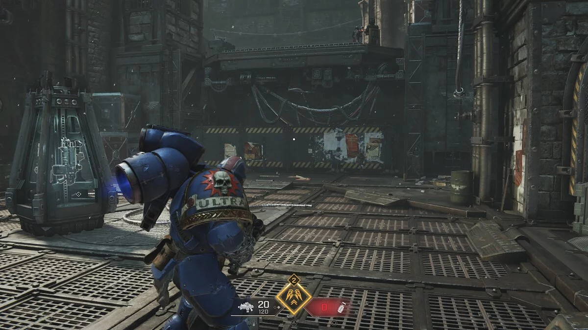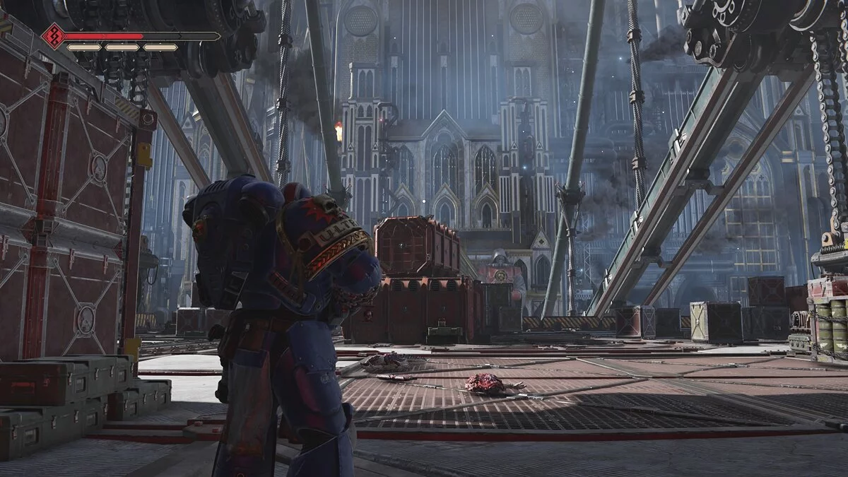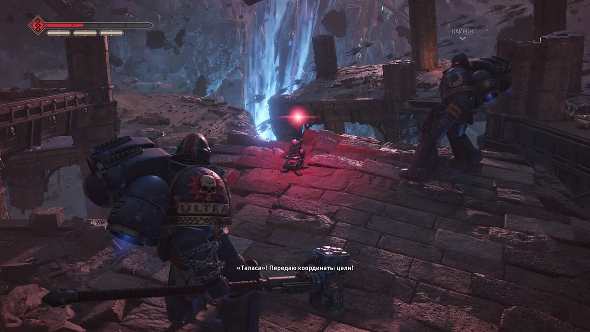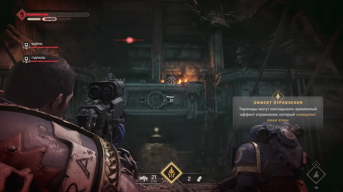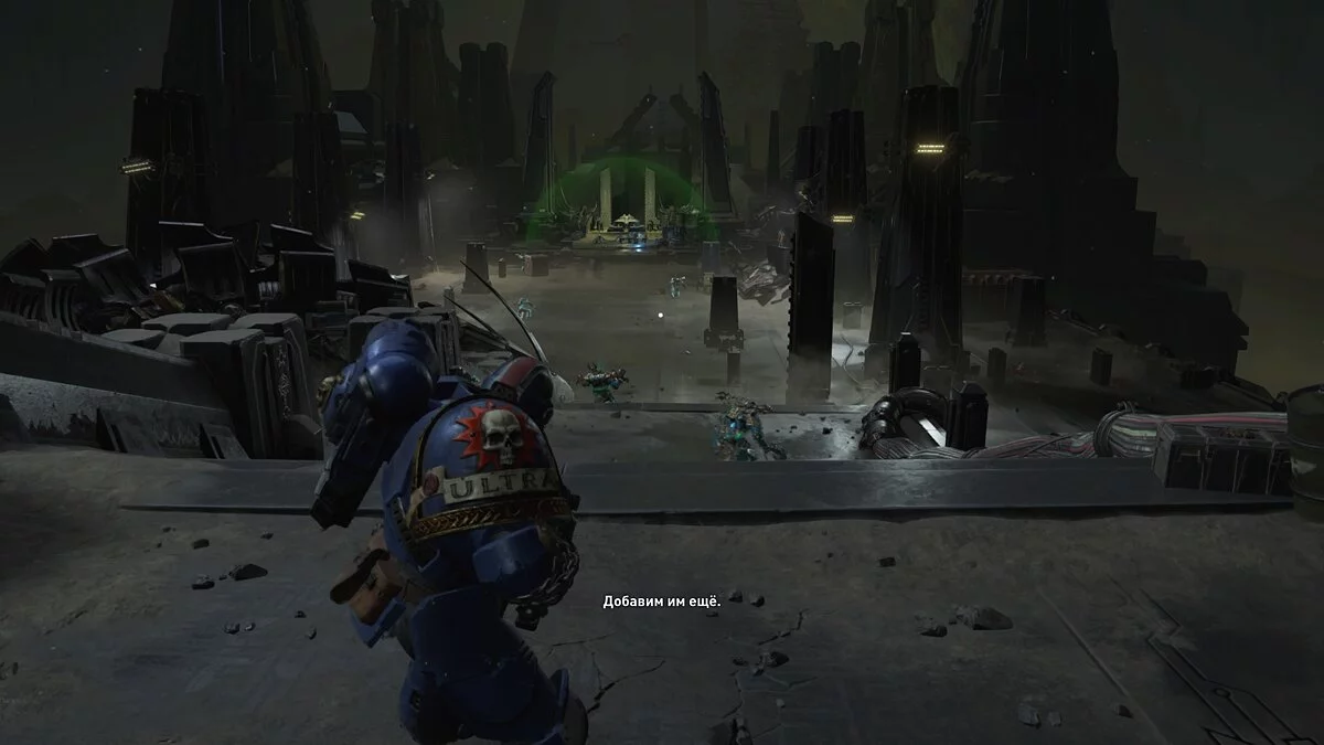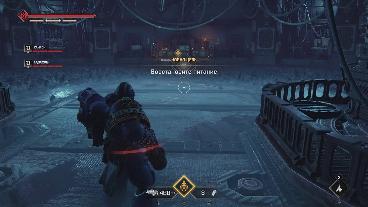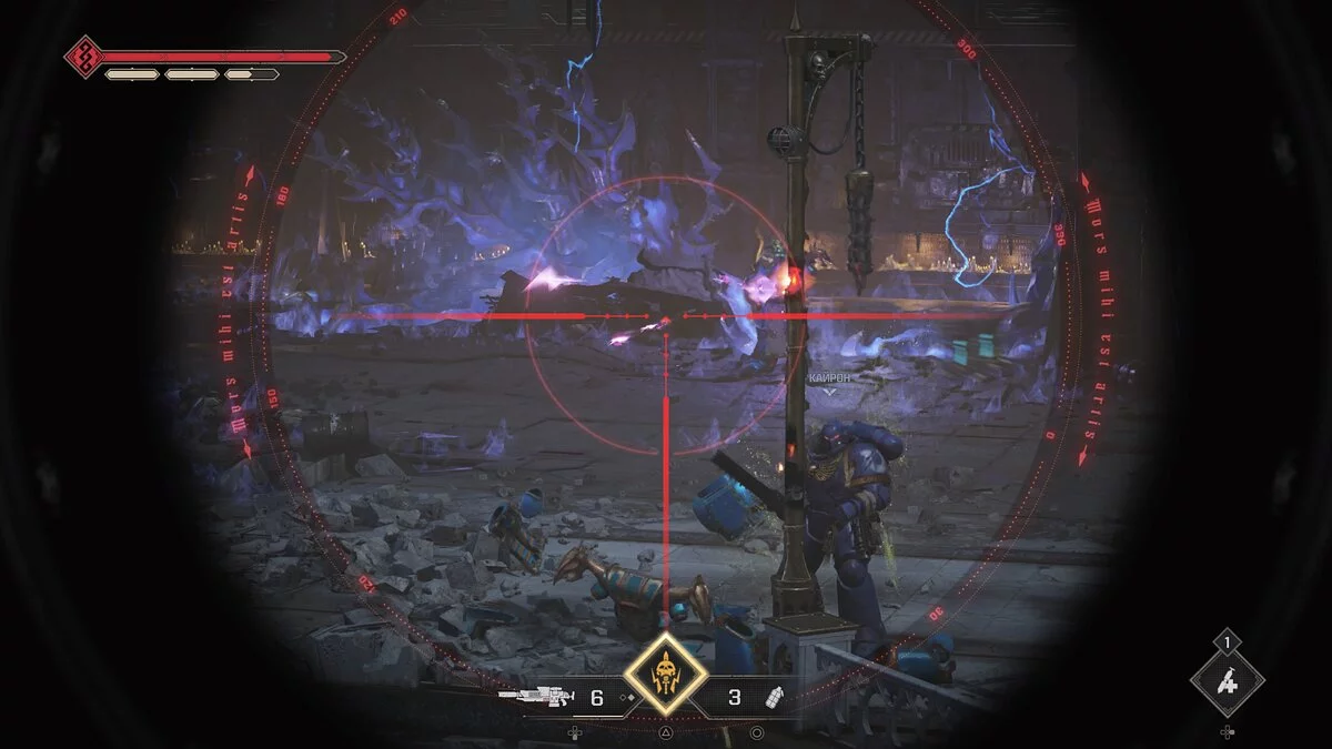 После видеоролика вы впервые столкнётесь с представителями Хаоса. Каждый из них вооружён дальнобойной винтовкой, поэтому во время боя желательно держаться в укрытии. Рядовые еретики убиваются легко, а космодесантников Хаоса лучше атаковать в голову. Можете воспользоваться снайперкой, которая лежит рядом с центральной колонной. Если увидите, что на вас навели луч — уклоняйтесь в сторону.
