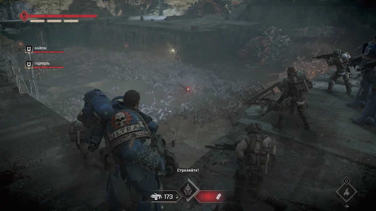 Когда окажетесь на поверхности планеты, двигайтесь вперёд, к бойцам имперской гвардии. Во время следующих сражений вам нужно будет следить за здоровьем напарников, которыми управляет искусственный интеллект или другие игроки. Если они упадут — воскрешайте. Также обратите внимание на режим ярости, который активируется кнопкой «треугольник». Он позволяет резко увеличить атаку, а ваши успешные удары в ближнем бою будут восстанавливаться здоровье. Чтобы заполнить шкалу ярости, просто убивайте противников.