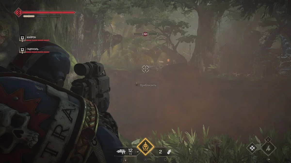 Двигайтесь вперёд по коридору из джунглей и уничтожайте ксеносов. Обратите внимание на крак-гранату. Она приклеивается к цели и наносит ей огромный урон, но у неё малая область поражения. Эту взрывчатку стоит применять против особо сильных ксеносов. Также на стойке оружия вы можете заметить болт-винтовку «Сталкер». Она позволяет вести огонь одиночными выстрелами с увеличенным уроном.