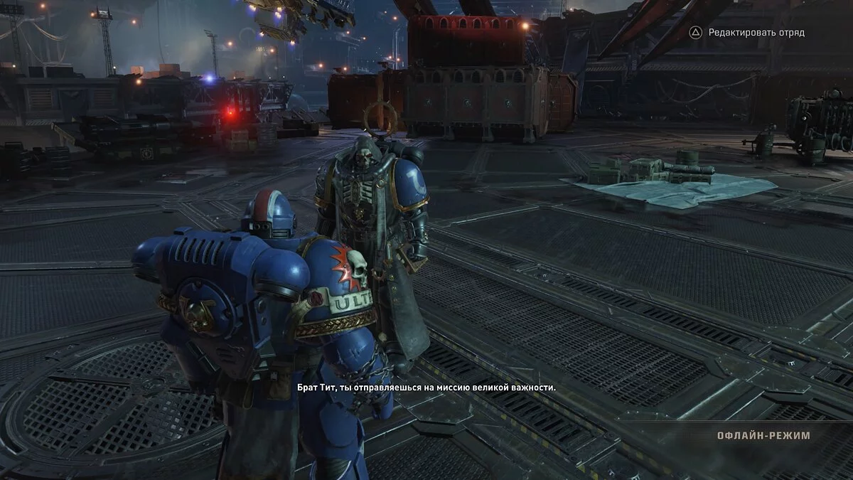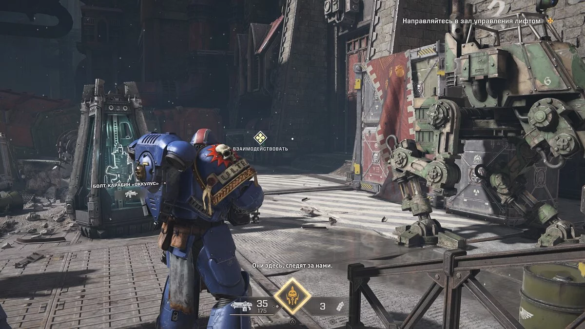 Вам вернули доспехи Ультрамарина и статус бойца этого элитного ордена космодесанта. Первым делом подойдите к лифту, поднимитесь на этаж выше и поговорите с капитаном. Затем спускайтесь вниз и садитесь на борт Громового ястреба.