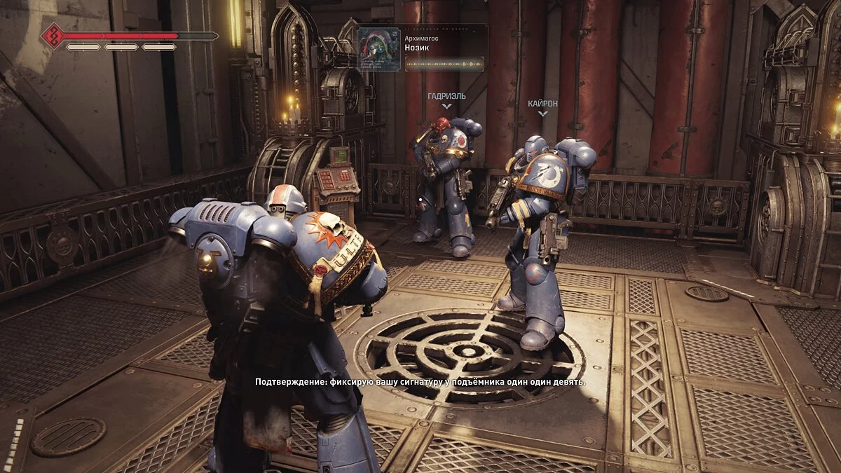 Нажмите на кнопку рядом с дверью, а затем — на терминале в центре комнаты. Свет погаснет, а на вас со всех сторон будут нападать тираниды. Рекомендуем встать в углу, чтобы у ксеносов не было возможности обойти вашего героя сзади. После этого сжигайте их огнемётом. Если он перегреется — переходите на гранаты, а выживших добивайте цепным мечом. На лифте поднимайтесь наверх.