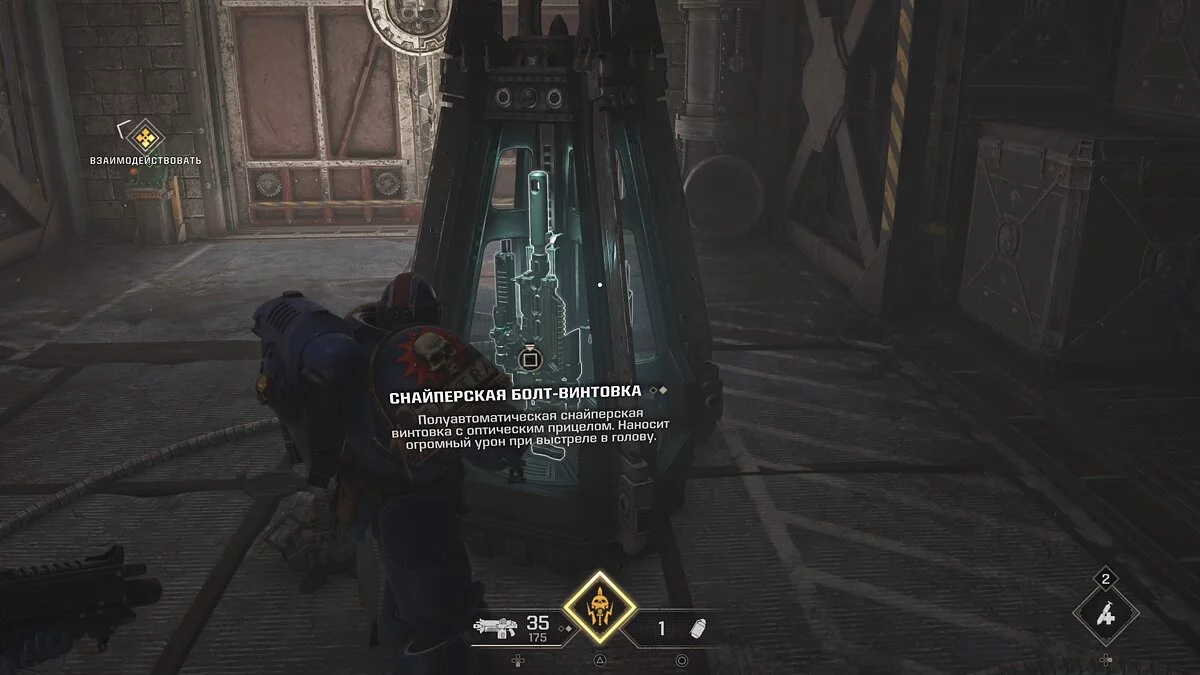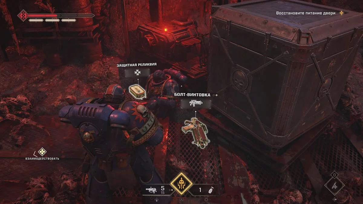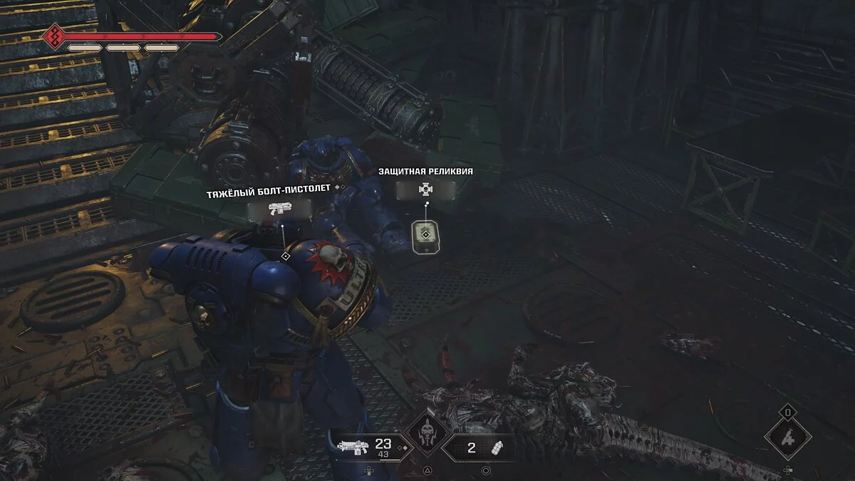 Около трупа космодесантника подберите защитную реликвию. Она позволит самостоятельно подняться на ноги после смертельного ранения. В результате вы сможете прожить дольше, что будет полезно в следующих боях.