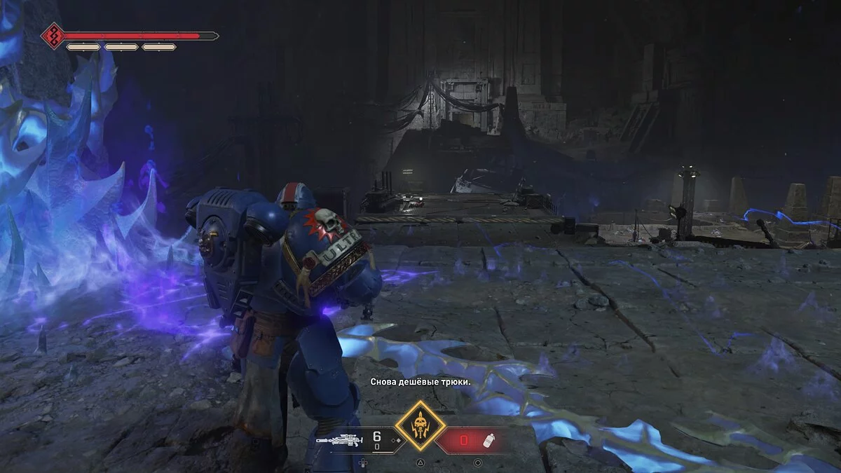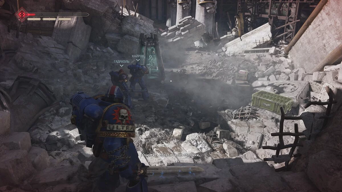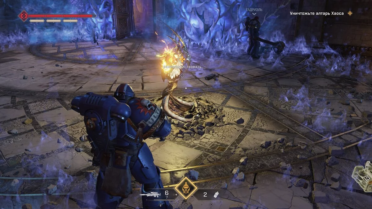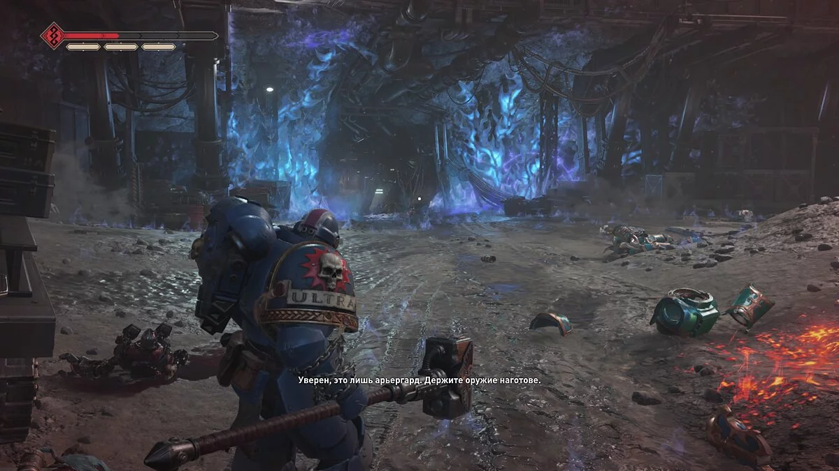 На вас нападёт отряд Ультрамаринов. В первую очередь убивайте колдуна, который стоит за их спинами. Затем бейте космодесантников Хаоса. После победы над ни ми синий туман развеется, и вы сможете подняться наверх по ступенькам. Справа вы увидите лечебные стимуляторы и оружие. Рекомендуем взять дальнобойную болт-винтовку со встроенным гранатомётом. Она вам пригодится в следующем бою. Расчищайте дорогу от камней и двигайтесь к Авроре. Бойцы Архиврага перед вами — иллюзии, нет смысла тратить на них патроны.