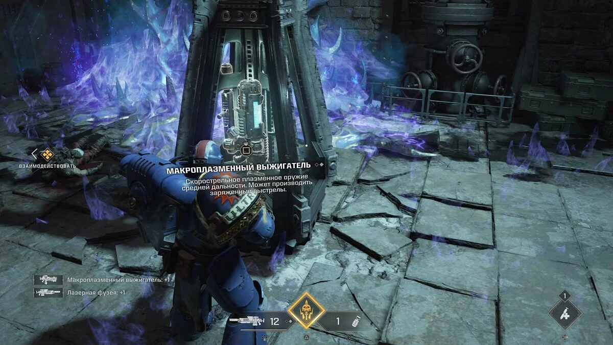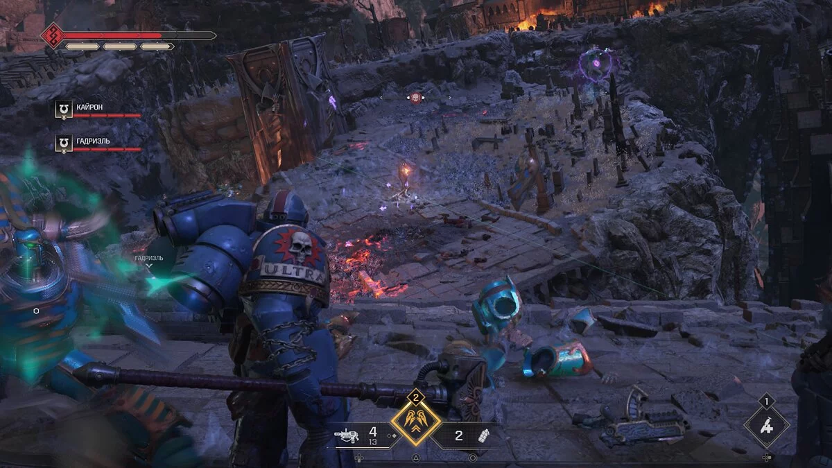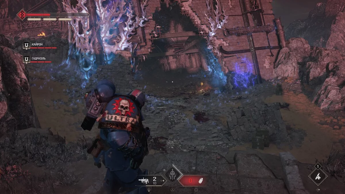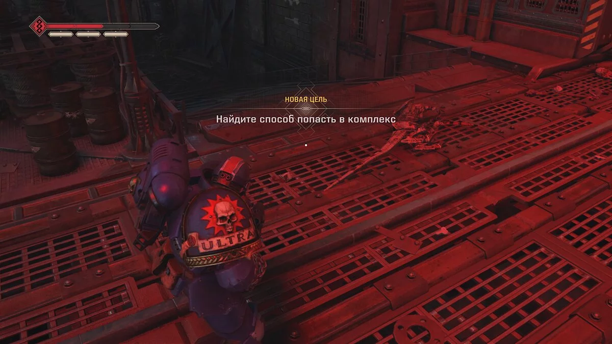 На вас нападёт отряд Ультрамаринов. В первую очередь убивайте колдуна, который стоит за их спинами. Затем бейте космодесантников Хаоса. После победы над ни ми синий туман развеется, и вы сможете подняться наверх по ступенькам. Справа вы увидите лечебные стимуляторы и оружие. Рекомендуем взять дальнобойную болт-винтовку со встроенным гранатомётом. Она вам пригодится в следующем бою. Расчищайте дорогу от камней и двигайтесь к Авроре. Бойцы Архиврага перед вами — иллюзии, нет смысла тратить на них патроны.