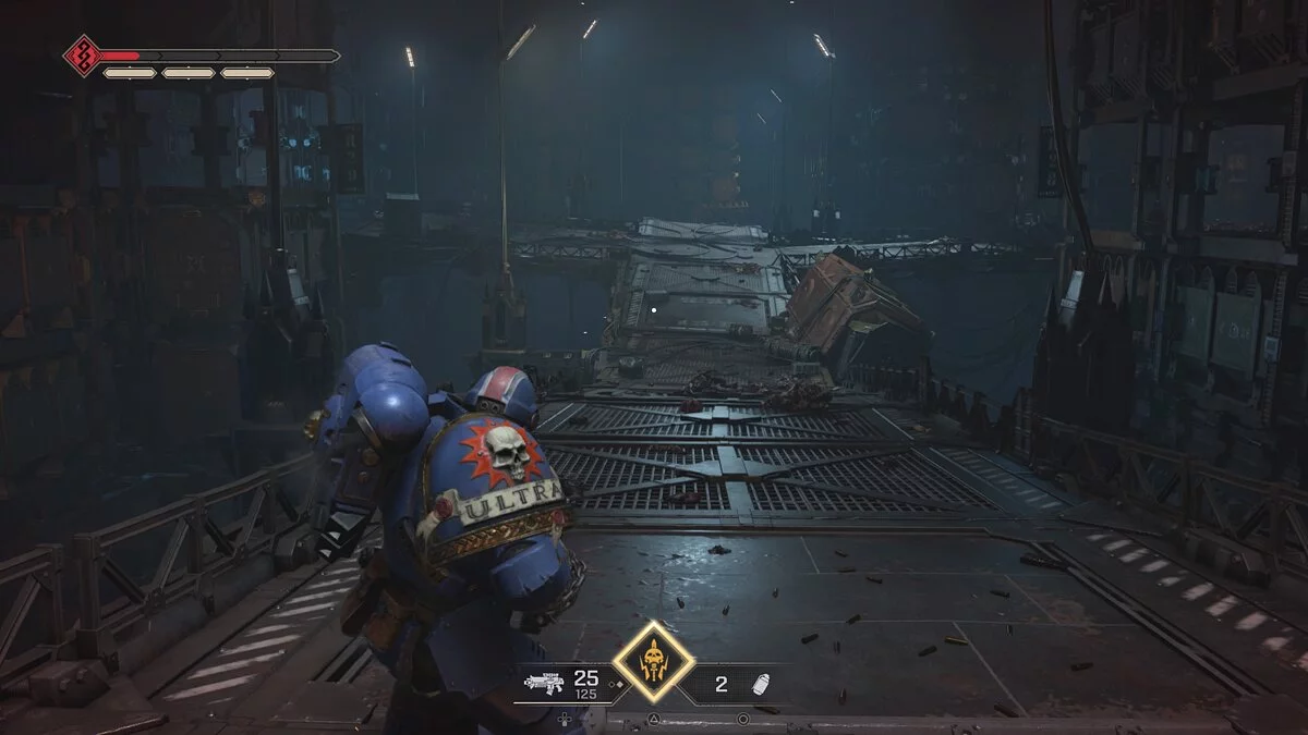 Зачищайте от врагов кольцо вокруг пропасти и двигайтесь через проход в дальней левой стороне. Двигайтесь вперёд, пока не увидите подбитый танк. Убивайте космодесантников Хаоса, которые засели на противоположной стороне пропасти, после чего бегите в левую сторону. Перед выходом не забудьте забрать мультимельту.