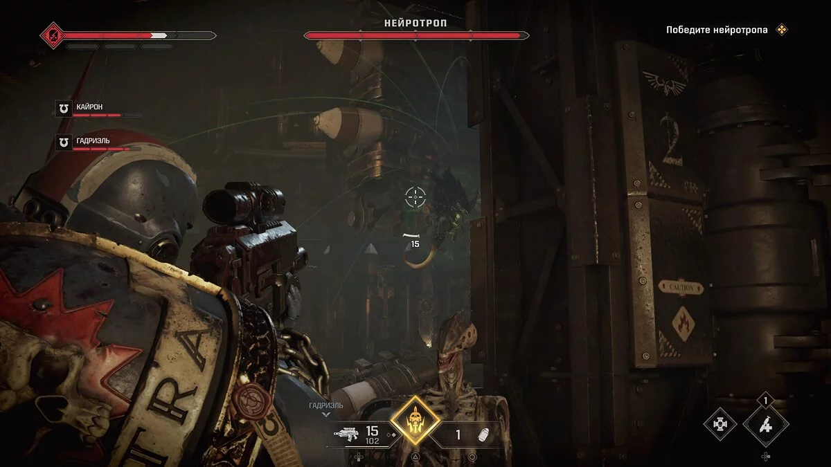 Этот тиранид умеет становиться невидимым, как Хищник из одноимённого фильма. Важно увернуться от его стремительной атаки, которая сопровождается криком и красным знаком на экране. После этого появится возможность провести серию выстрелов. Ждите его удара, парируйте и сразу же стреляйте. С большой вероятностью прицельное попадание нанесёт боссу огромный урон. Отметим, что отразить можно не только те атаки, которые отображаются белым цветом, но и все остальные, за исключением красных. Осколочные против Ликтора бесполезны, ведь он слишком быстро двигается, но вы можете воспользоваться крак-гранатами, если вам удастся прикрепить их к телу ксеноса. На рядовых тиранид не обращайте внимания, лучше сосредоточьтесь на боссе.