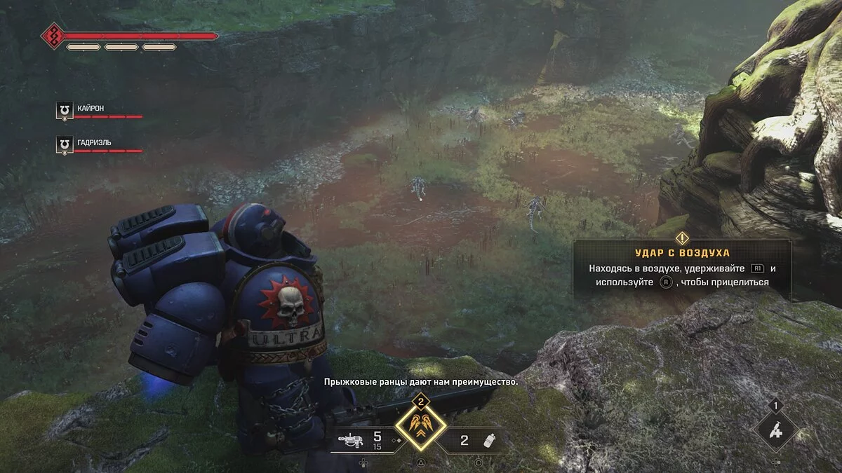 Вас ждёт первая битва с ксеносами, где вы можете использовать джетпак. Взмывайте в воздух и наносите удары мечом по самым сильным из них. При желании вы можете вести огонь из огнестрельного оружия, пока находитесь в воздухе. Уничтожайте тиранид и забирайтесь ещё выше.