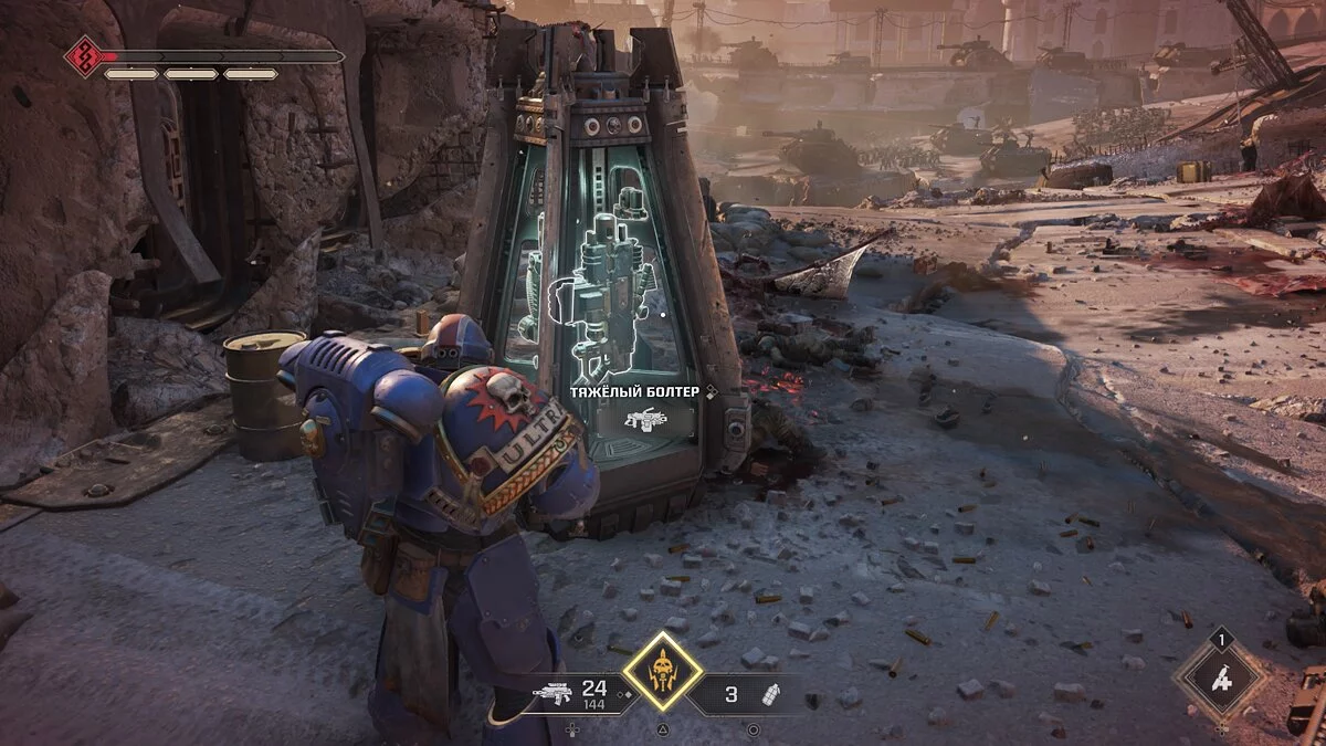 Продолжайте двигаться вперёд и попутно уничтожать тиранидов. Дойдите до уступа и прыгайте вниз. Там рекомендуем заменить обычный болт-пистолет на его тяжёлую версию. Он стреляет медленнее, но его урон значительно выше. Возвращайтесь назад и бегите в левую сторону, пока не увидите бойцов имперской гвардии.