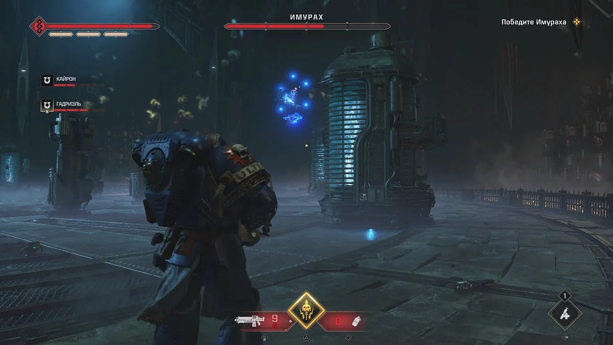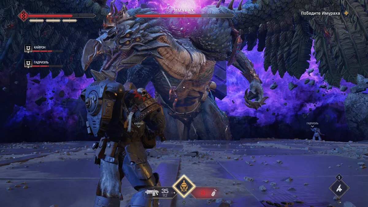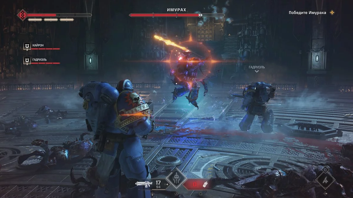 Хаосит будет кидать в вас шоковые гранаты. Важно не стоять в зоне из действия. Об атаке лучом вас предупредят заранее красным сигналом. Как обычно, в подобных случаях нужно уклоняться в сторону. От ударов по площади вас защитят колонны, которые стоят на арене. Аккуратно выцеливайте Имураха и стреляйте по нему. Правда, на этот раз игнорировать его подручных не получится. Как только он вызовет на поле боя демонов или космодесантников-еретиков — атакуйте сначала их, а уже затем стреляйте по боссу.