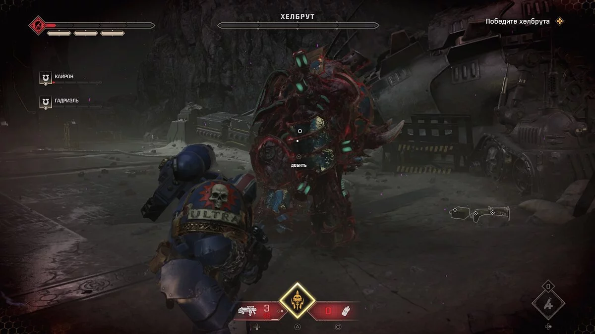 Здесь важно следить за ударами босса в ближнем бою. Уворачивайтесь от красных атак и парируйте синие. Те выпады, которые можно отразить, всегда двойные. После этого у вас появится возможность совершить критический выстрел. Если Имурах схватил вашего союзника — высаживайте в хаосита очередь из автомата. В этот момент он уязвим и ничего не сможет сделать в ответ. Стрелять по нему можно и в остальное время, но нужно быть всегда готовым к неожиданным ударам.