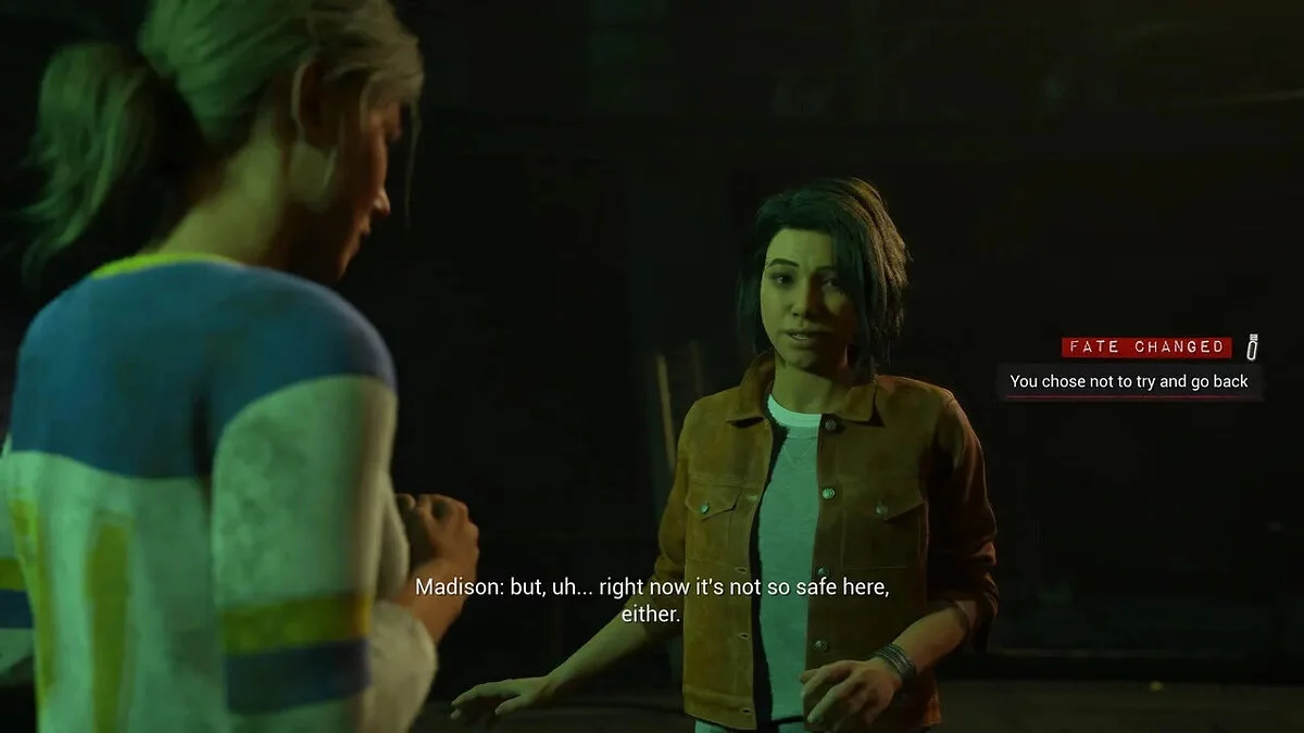 Десятая глава возвращает вас в современность с Мэдисон, но Крис теперь была втянута в настоящее время. Чтобы получить лучшую концовку, где все выживают, вам нужно отправить Крис обратно в ее время, выбрав вариант диалога «С Надеждой» (Hopeful) при появлении подсказки. Не провалите QTE, иначе все пойдет ужасно неправильно, и вы потеряете персонажей.