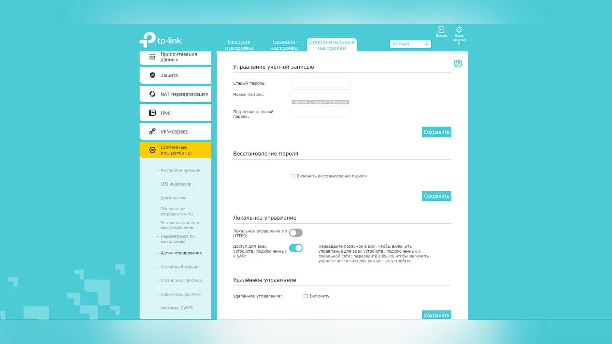 Если пароль вы помните, но хотите сохранить настройки и сменить его через настройки, то после успешного входа вы попадете в административную панель роутера. Интерфейс может различаться в зависимости от модели, но большинство роутеров имеют похожую структуру. Найдите раздел Administration, System, Management или Администрирование — этот раздел обычно содержит настройки безопасности. В этом разделе найдите опцию Change Password (Изменить пароль) или Router Password. Введите уже имеющийся пароль и задайте новый в соответствующее поле.