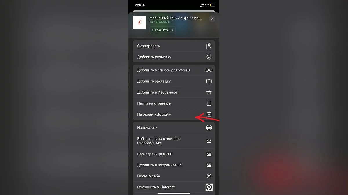 - Через функцию «Поделиться» выберите опцию «На экран Домой».