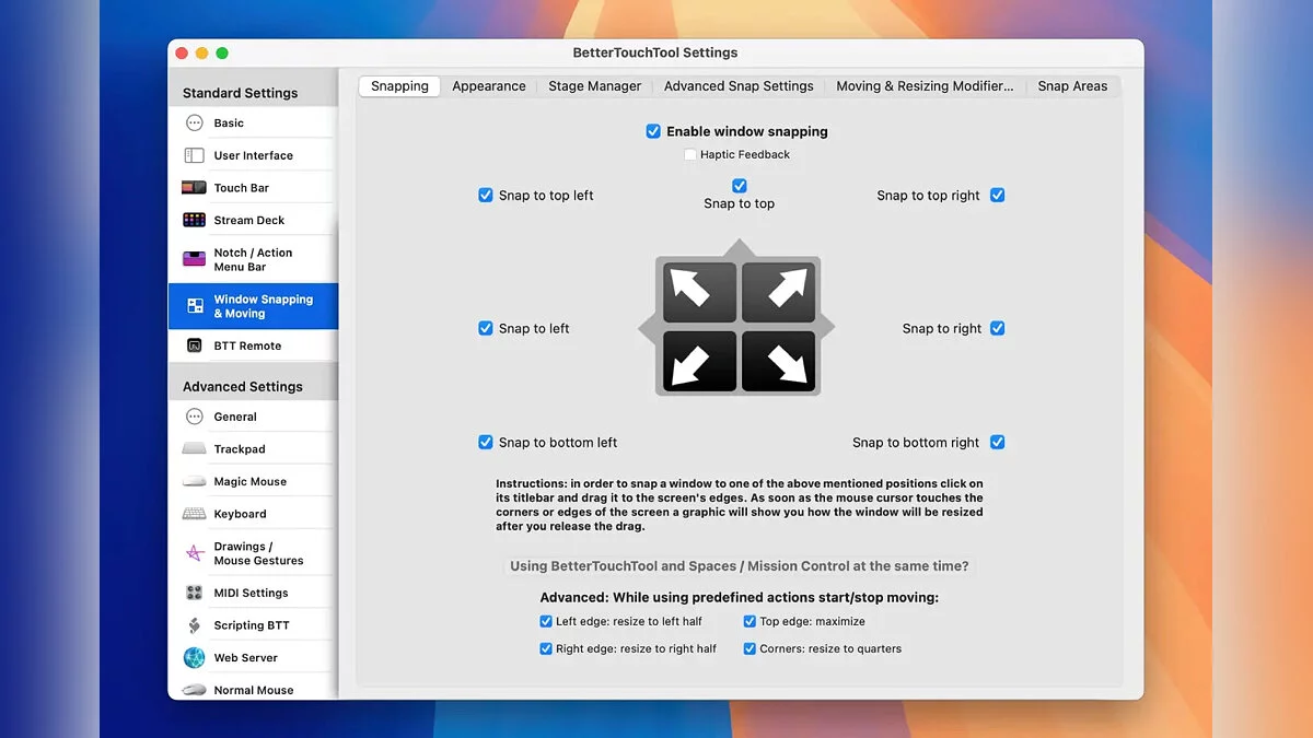 Одной из ключевых функций BetterTouchTool является управление расположением окон с помощью настраиваемых сочетаний клавиш. Эта функция предлагает пользователю гибкость в организации рабочего пространства и значительно превосходит стандартную систему управления окнами macOS.