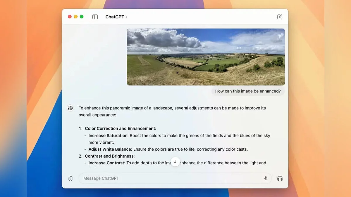 Приложение для macOS включает несколько дополнительных функций, которые делают его более удобным по сравнению с веб-версией. Например, оно позволяет загружать изображения напрямую из библиотеки «Фото», веб-камеры или через скриншот, что ускоряет процесс взаимодействия с изображениями. Также доступна возможность голосового общения с ChatGPT, что невозможно в браузере.