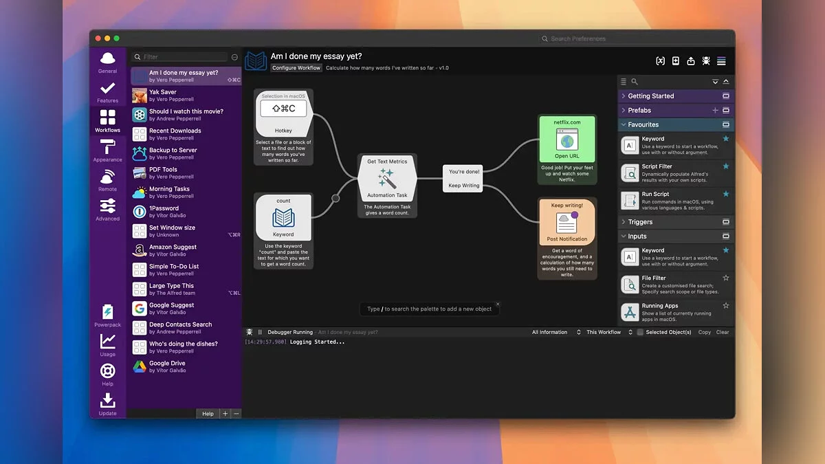 Ключевой функцией Alfred является Powerpack, который позволяет создавать сложные рабочие процессы для автоматизации практически любых задач. Пользователь может связывать горячие клавиши, ключевые слова и действия в комплексные автоматизации, при этом не требуется написание кода.