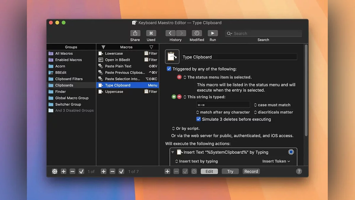 Программа поддерживает широкий спектр задач — от запуска приложений и открытия веб-сайтов до создания отчётов и управления историей буфера обмена. Keyboard Maestro позволяет объединять действия в сложные процессы с условиями, циклами и другими элементами, что делает его очень гибким и способным справиться практически с любой задачей.