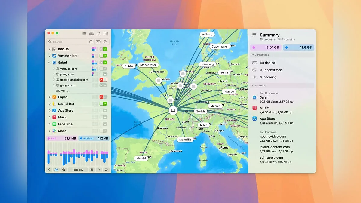 Little Snitch не ограничивается только блокировкой приложений — оно также позволяет контролировать подключение к веб-сайтам, предоставляя детальный контроль над тем, какие данные поступают на ваш Mac и отправляются с него. Приложение также оснащено аналитическими инструментами, которые помогают чётко понимать, что происходит с трафиком, предоставляя пользователю полную информацию.
