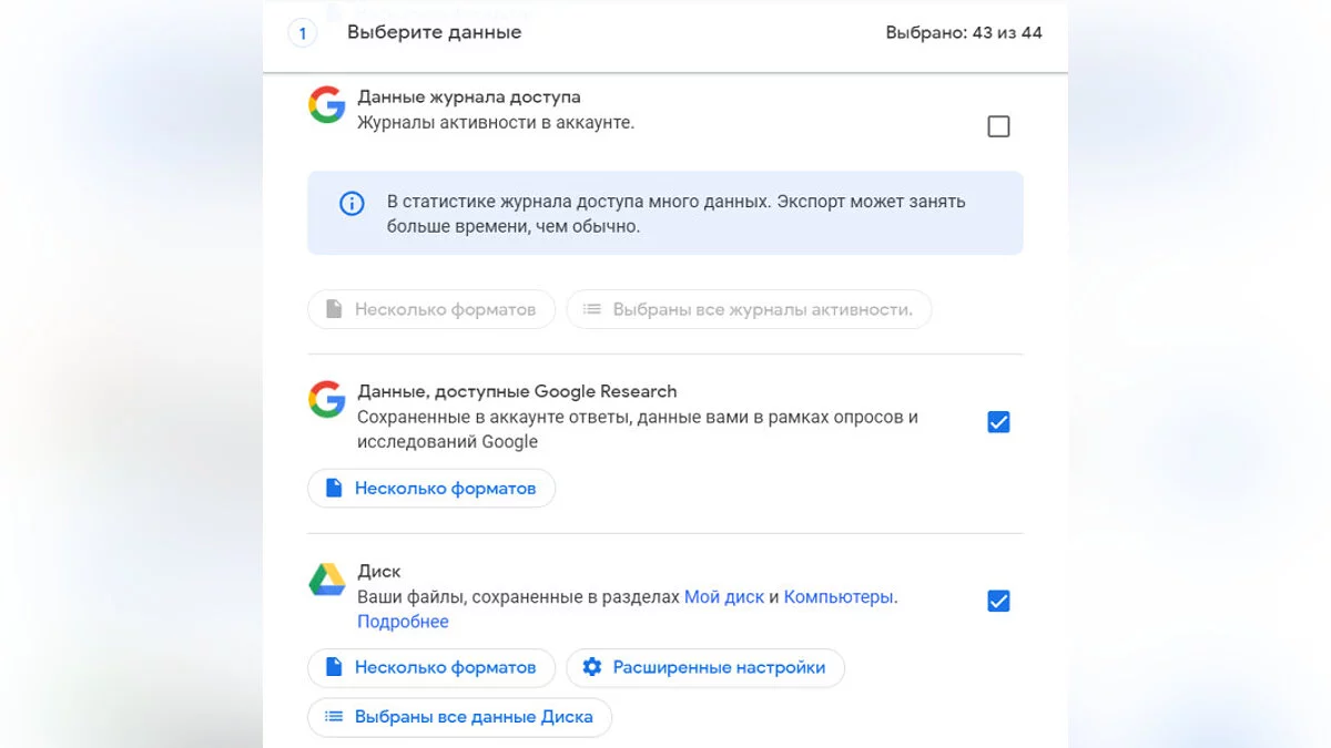 Важно обратить внимание, что скачивание данных с Google не удаляет их с серверов компании. Вы можете экспортировать и скачать данные из продуктов Google, которыми пользуетесь, например:
