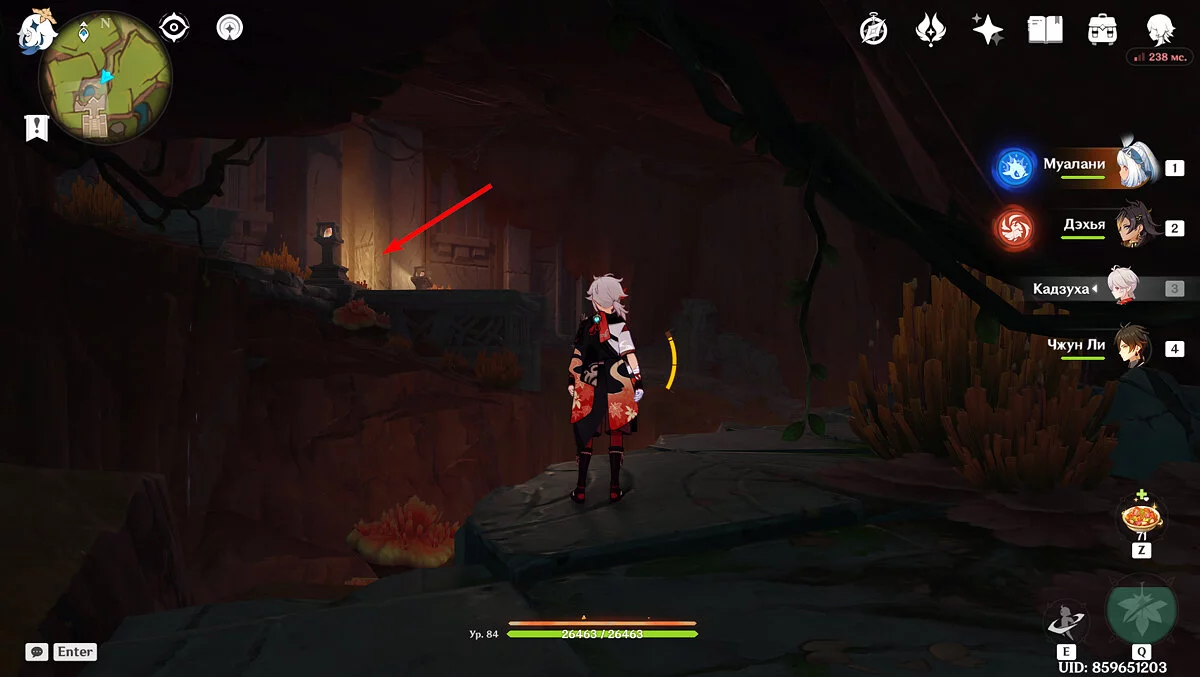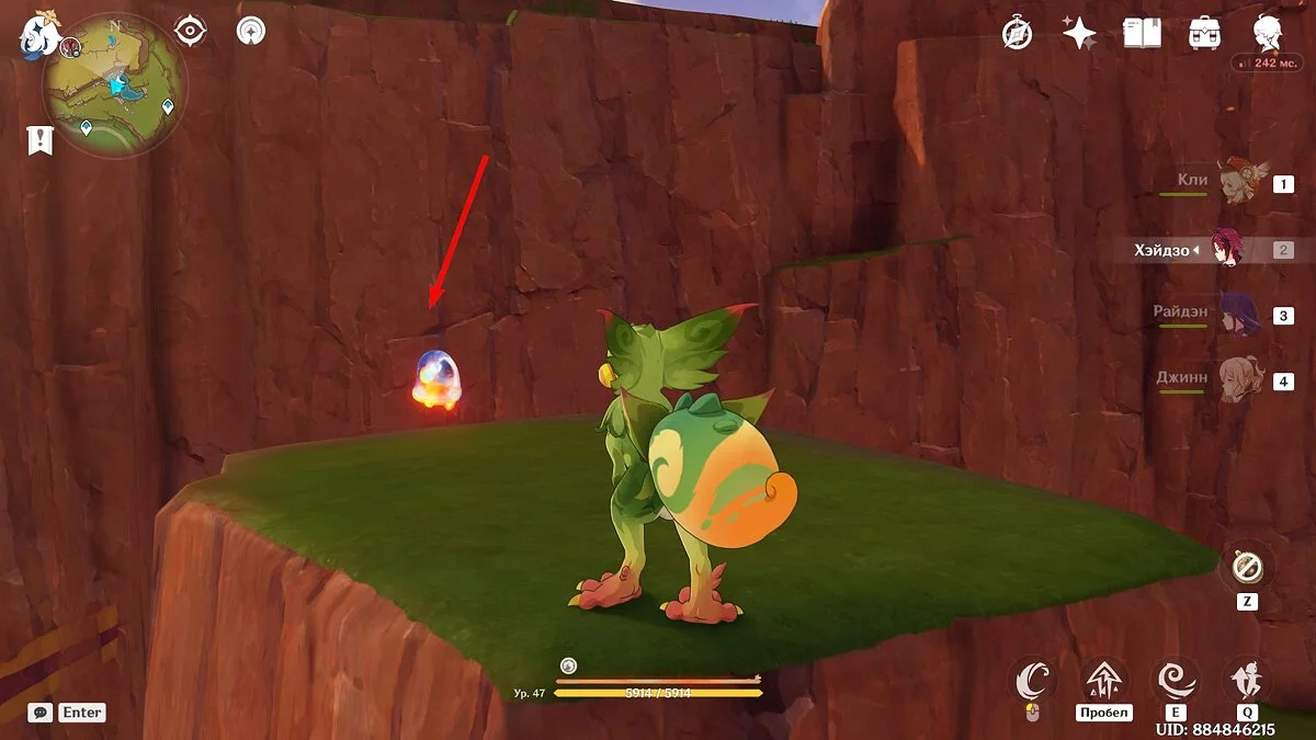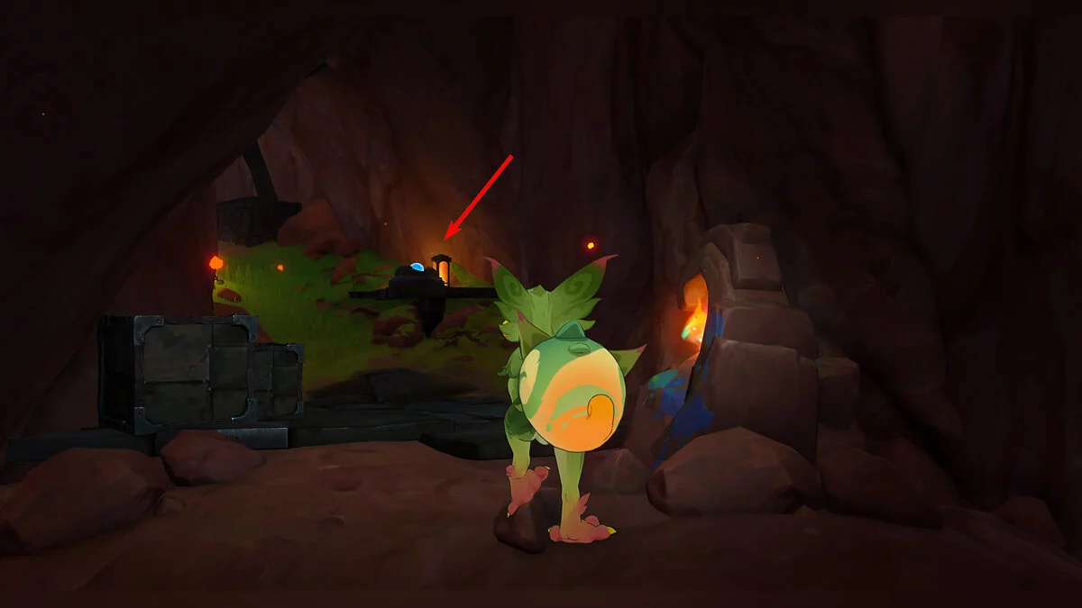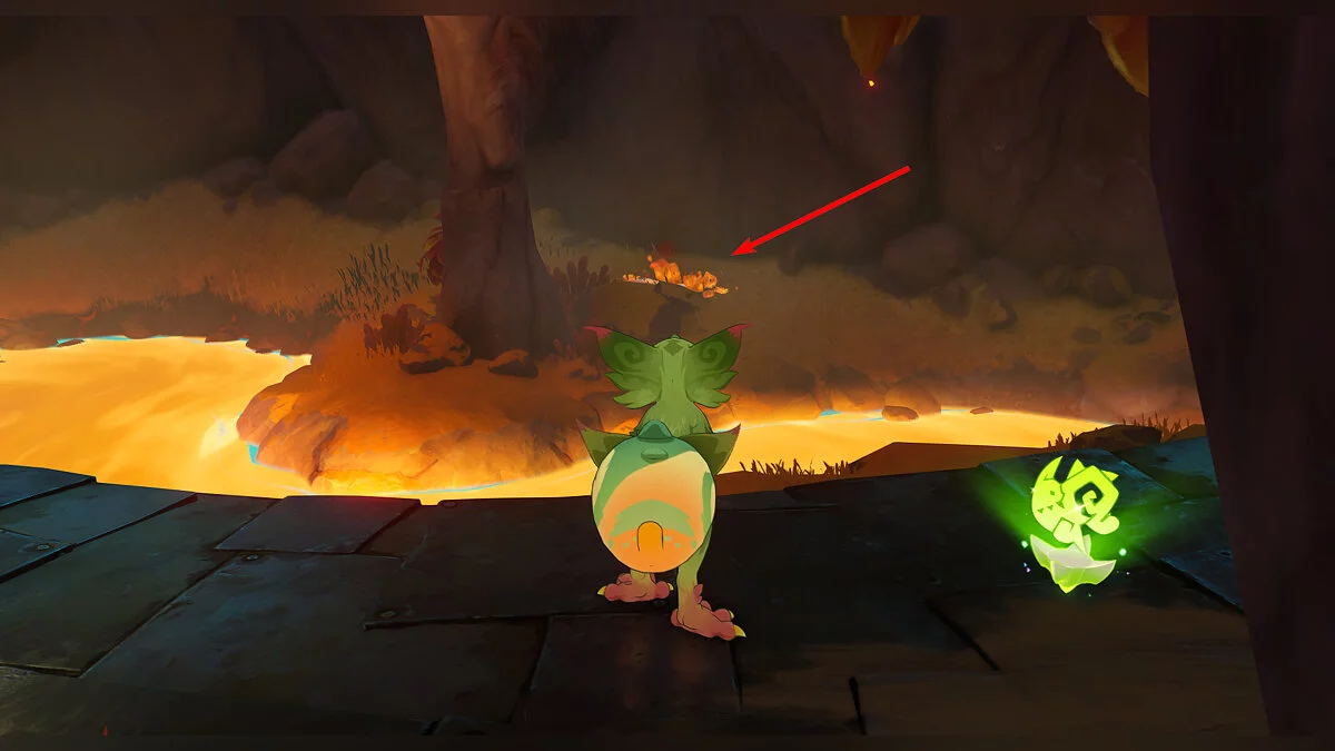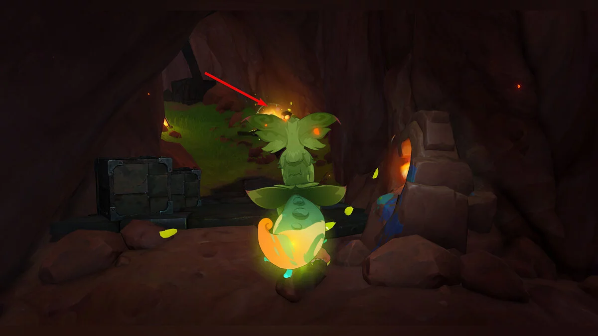 Во-первых, соберите местную диковинку — пепельник. Это такие оранжево-красные бутоны, которые распускаются если атаковать их Пиро. Нужен всего один цветок, если у вас его нет — пройдите чуть дальше, за сундуки и обнаружите на соседнем склоне несколько бутонов. Вернитесь к сундукам и положите один пепельник в миску. Появятся Пиро слаймы, которых нужно уничтожить, после чего откроется богатая сокровищница.