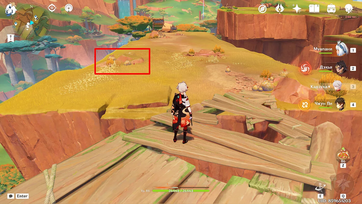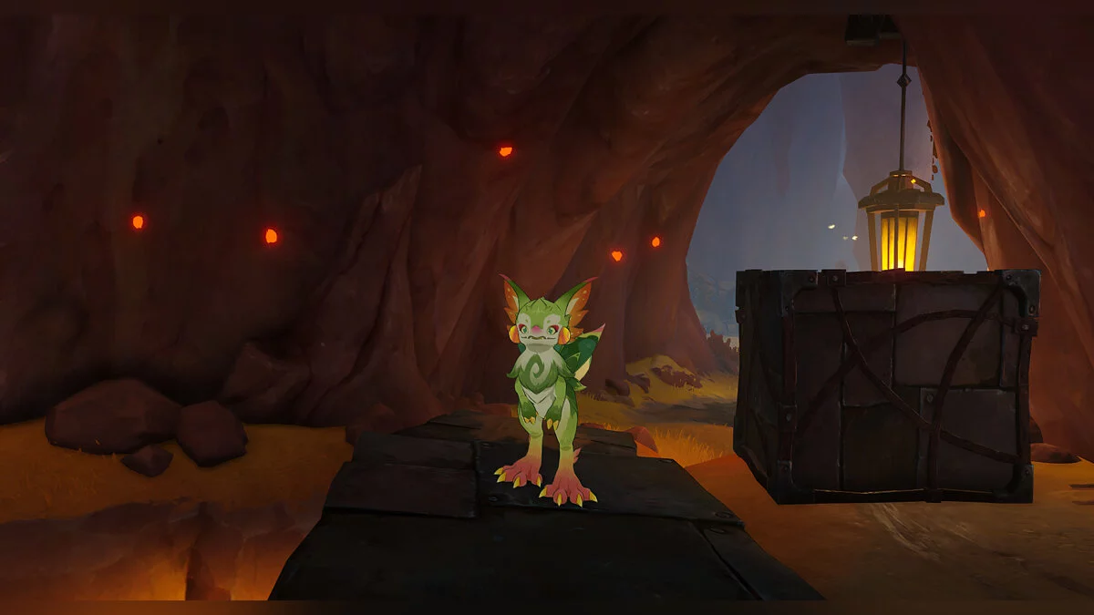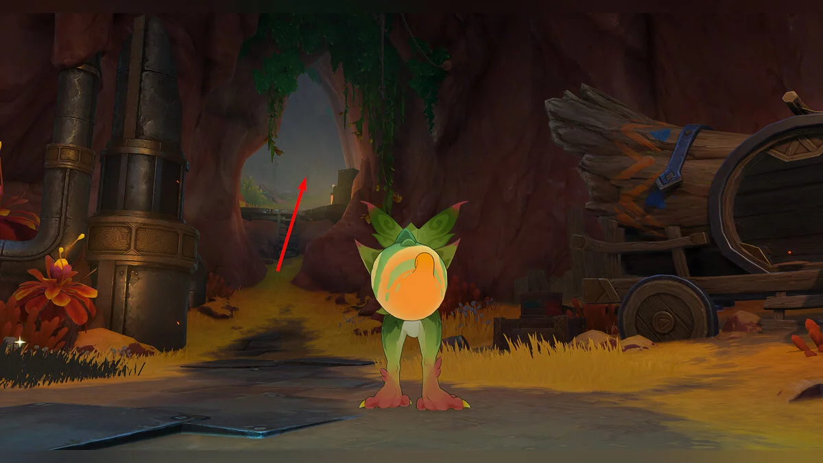 Продвигайтесь вглубь ущелья, мимо заврианов, пока не окажетесь возле небольшого оврага. Внизу будет стоять сундук, охраняемый Фатуи. Расправьтесь с врагами и откройте сокровищницу. Внутри будет сундук от телеги рядом. Откройте её и поговорите со спасённым юмказавром, после чего вселитесь в монумент рядом, продолжая движение уже в форме завриана.