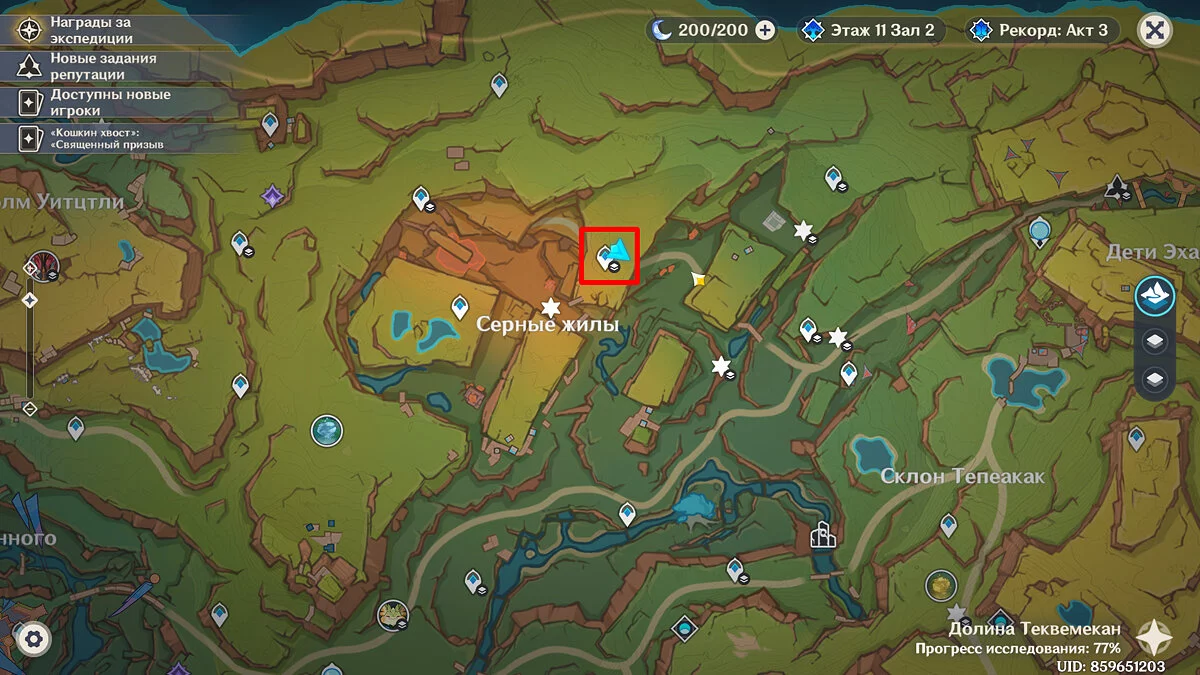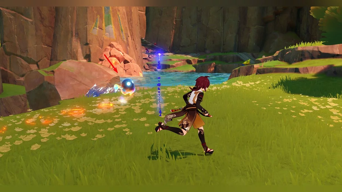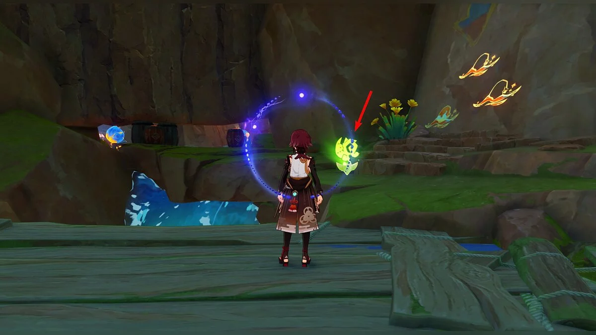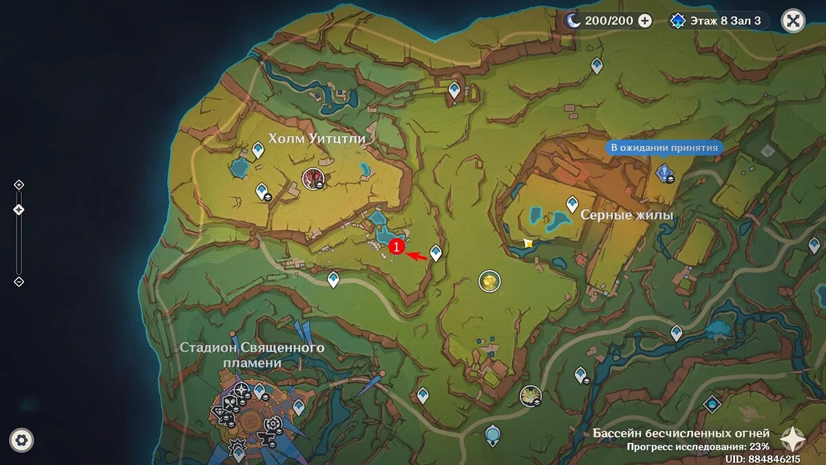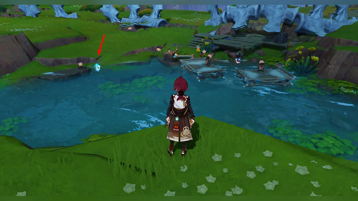 Телепортируйтесь к юго-западу от Серных Жил, что ниже Холма Уитцли, и направляйтесь к небольшому водоёму севернее, который отмечен на карте. Чтобы решить загадку, нужно использовать навыки заврианов, но перед этим уничтожьте врагов поблизости. Хиличурлов, которые стоят на плотах, легко утопить, поэтому разделайтесь сначала с противниками на земле.