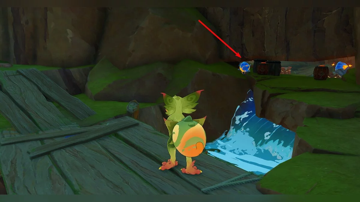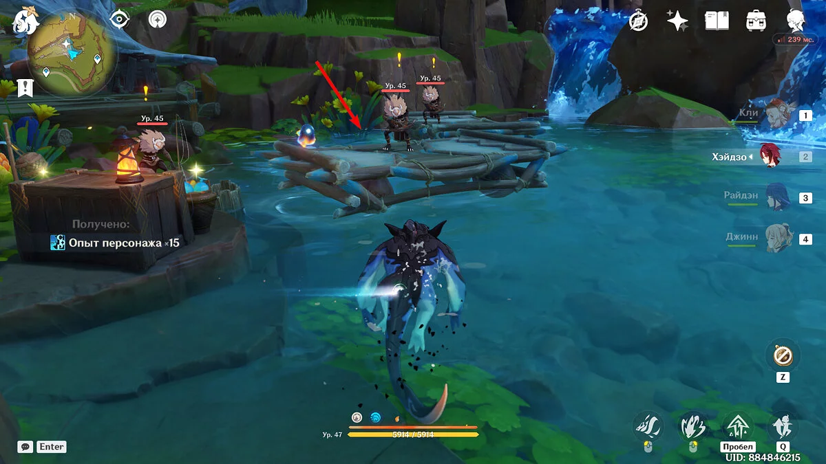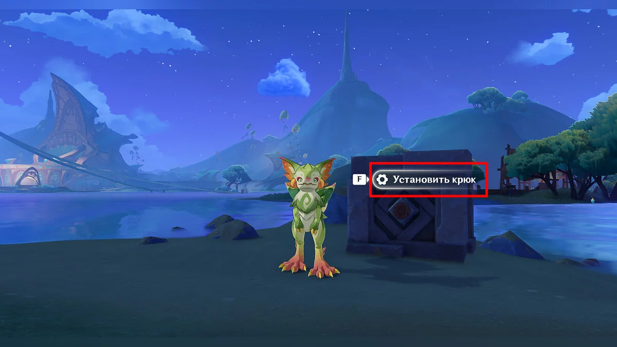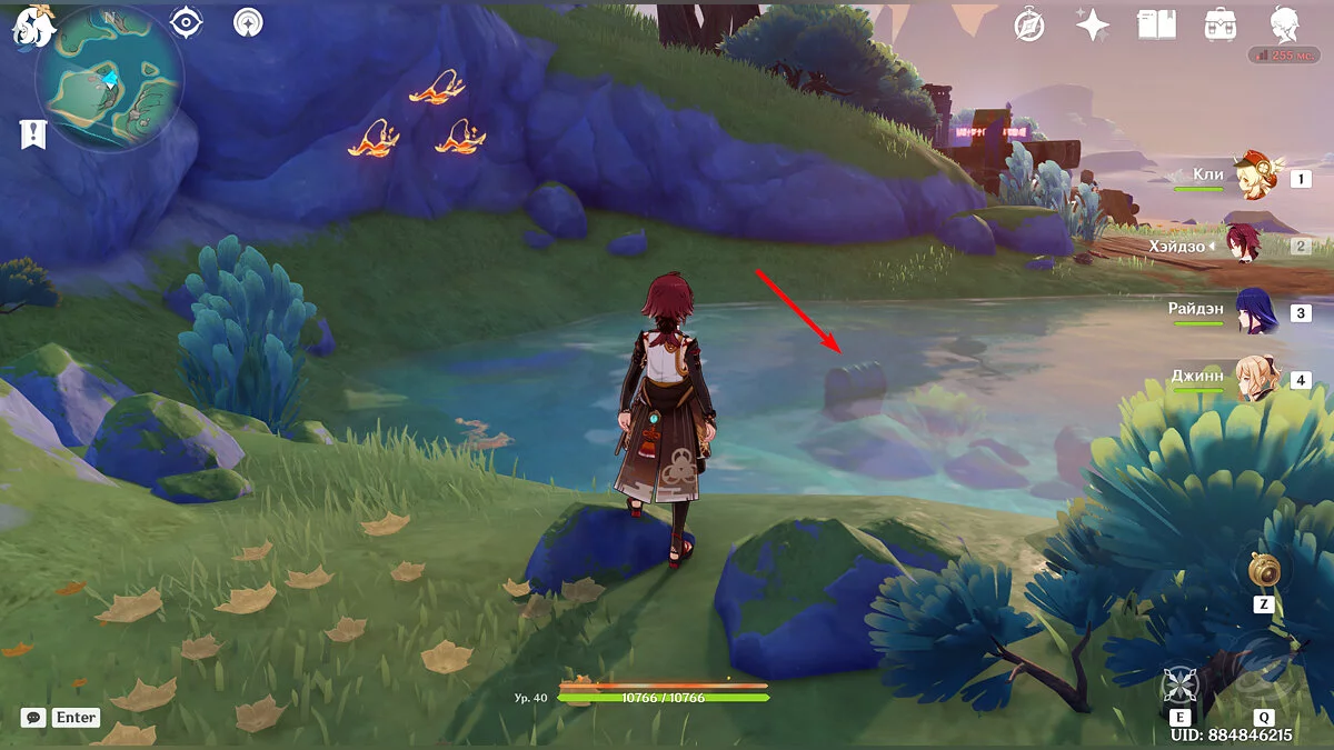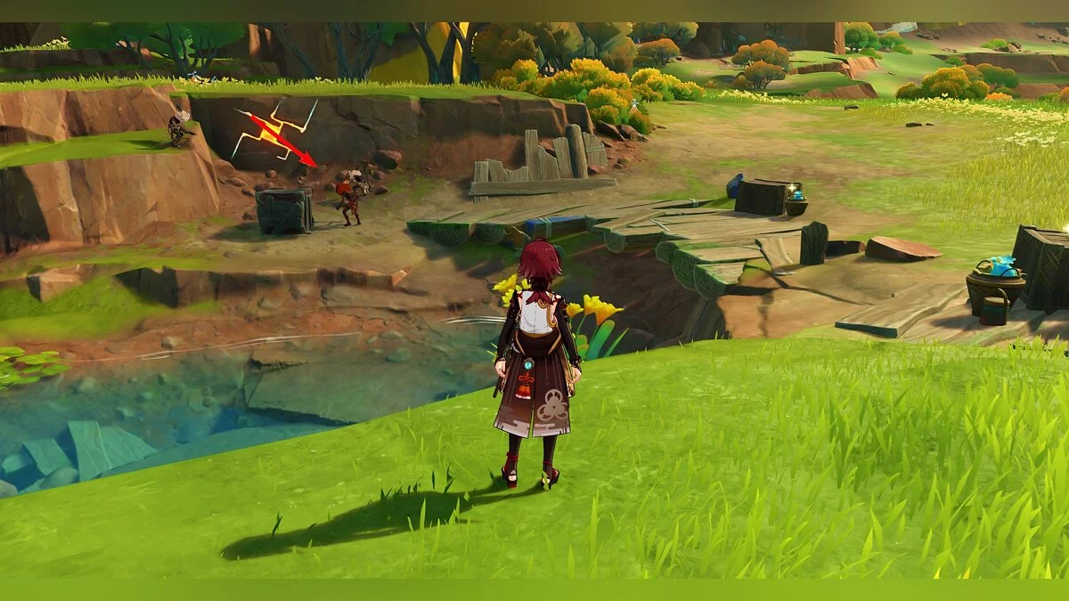 Телепортируйтесь к юго-западу от Серных Жил, что ниже Холма Уитцли, и направляйтесь к небольшому водоёму севернее, который отмечен на карте. Чтобы решить загадку, нужно использовать навыки заврианов, но перед этим уничтожьте врагов поблизости. Хиличурлов, которые стоят на плотах, легко утопить, поэтому разделайтесь сначала с противниками на земле.