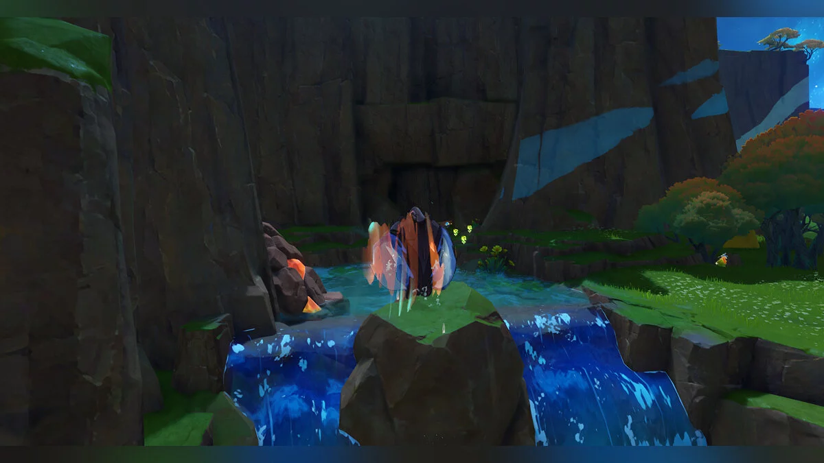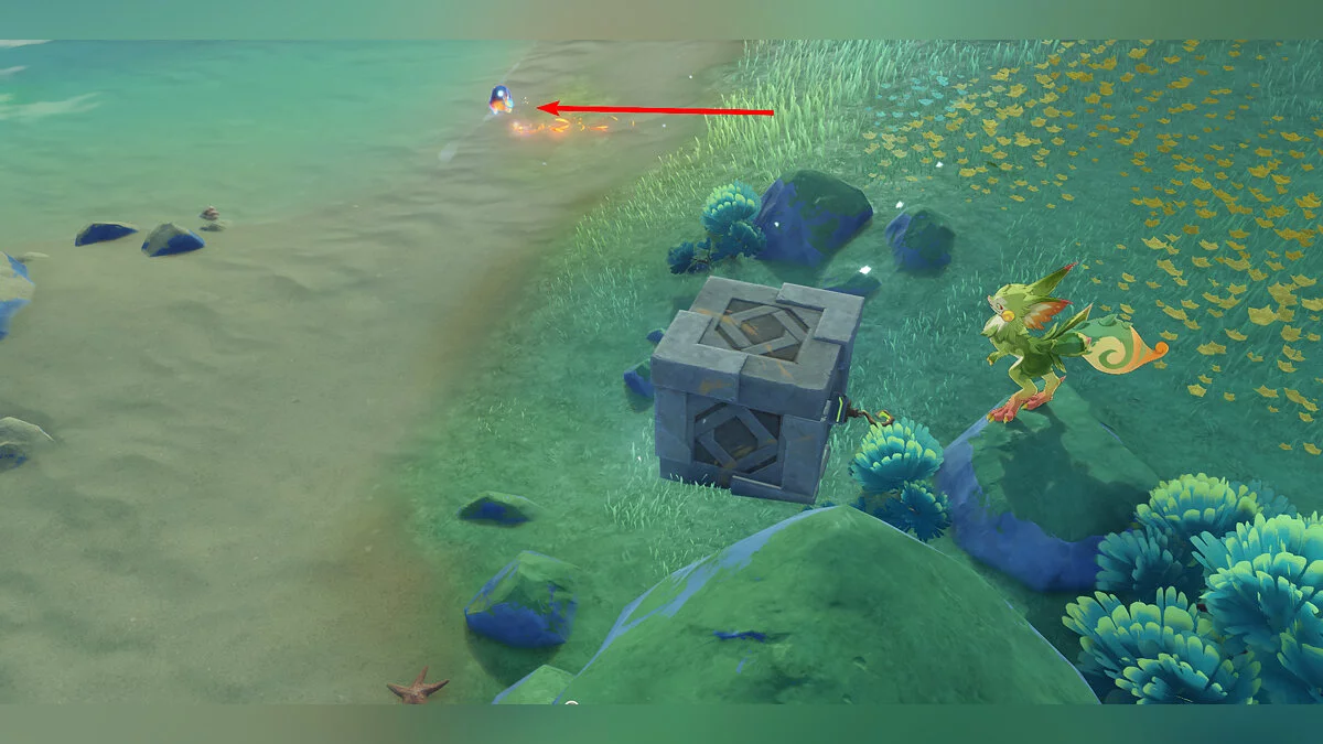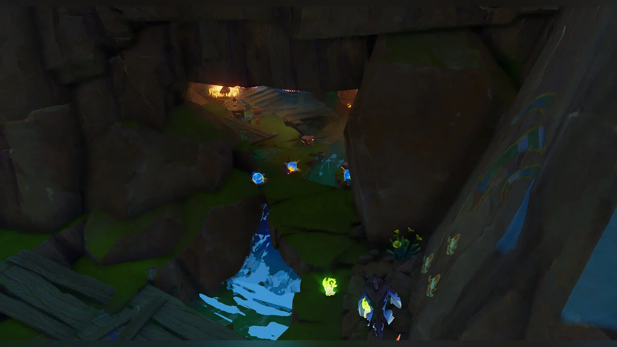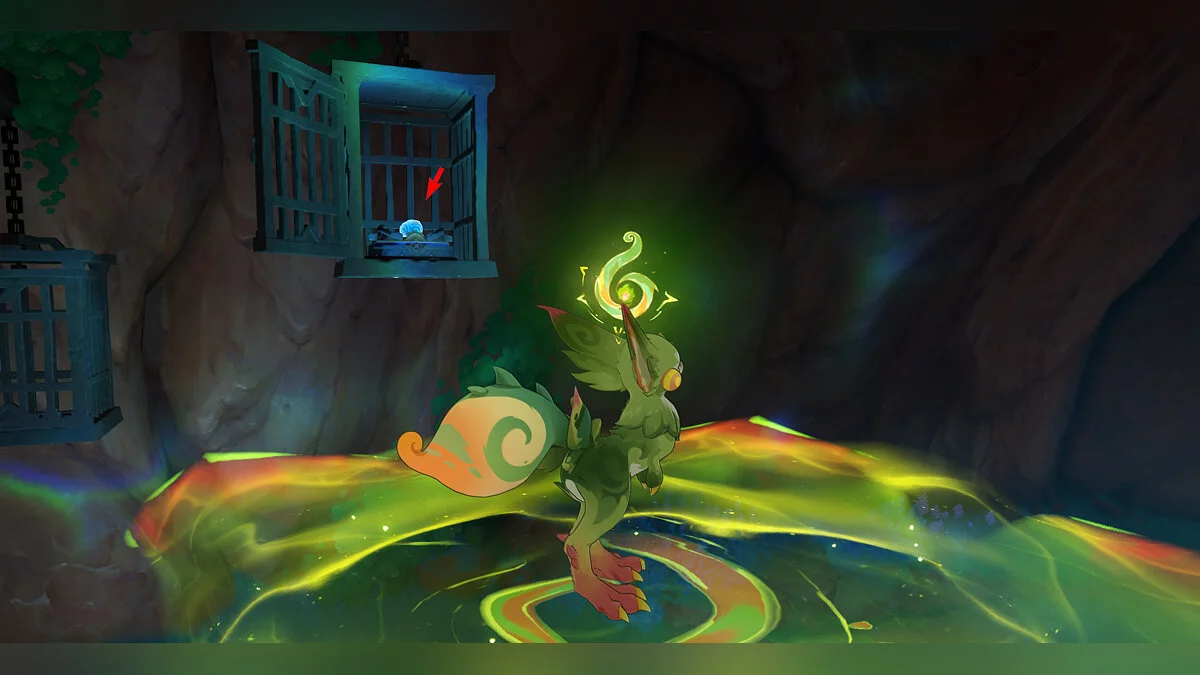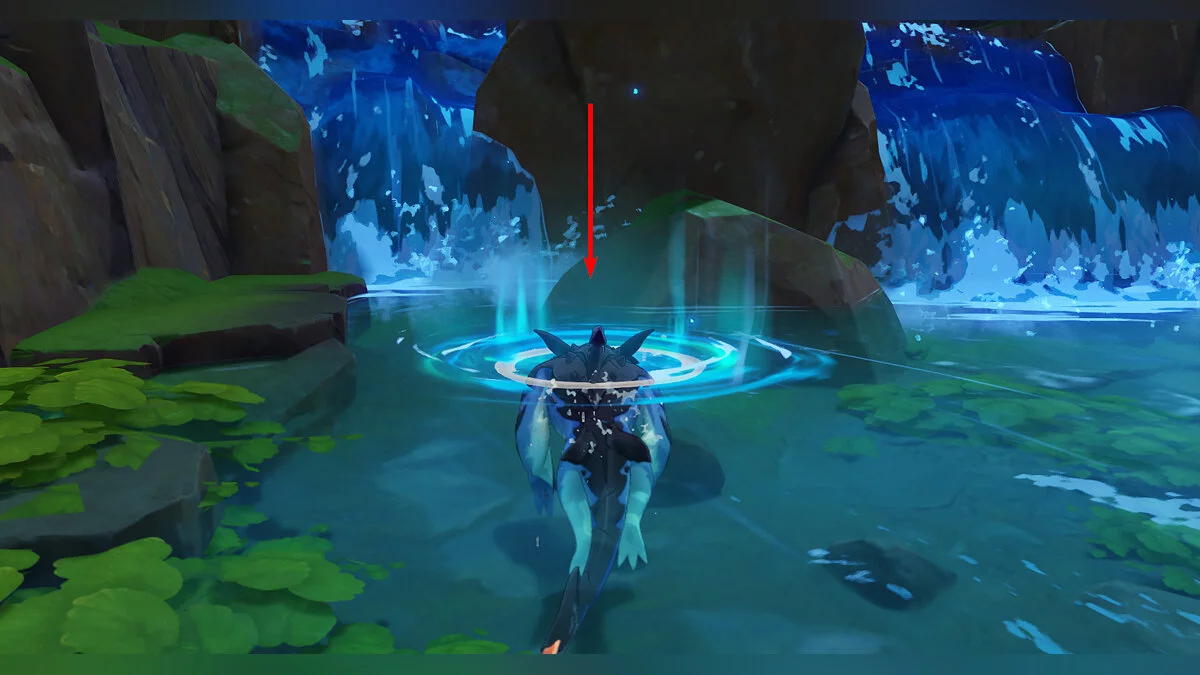 Затем спуститесь ниже и вселитесь в колохозавра. Сбейте рывком хиличурлов на плотах и проводите маниту к рисунку. Существо создаст воронку на воде, которая позволит завриану прыгнуть выше. Проводив последнего маниту, войдите в открытую пещеру и заберите сокровищницы — одну роскошную и два богатых.