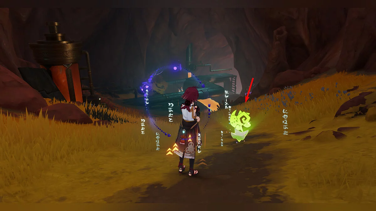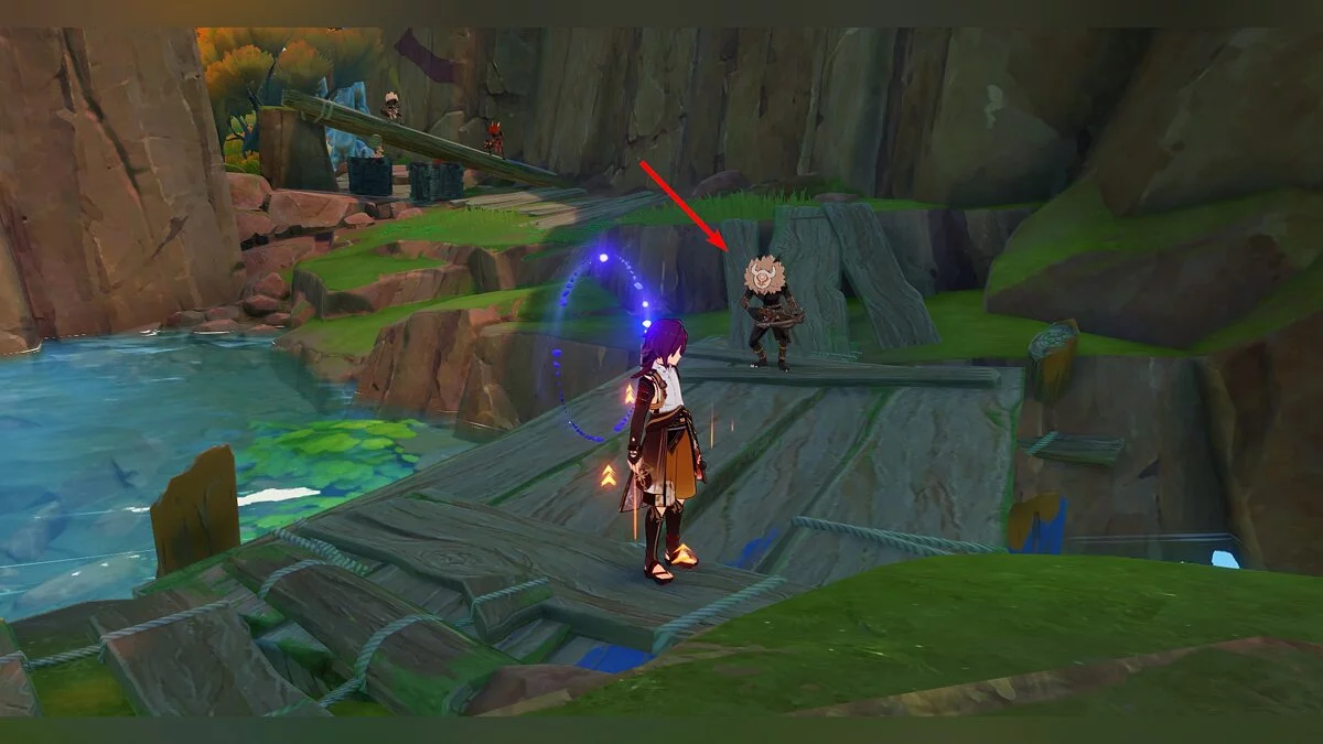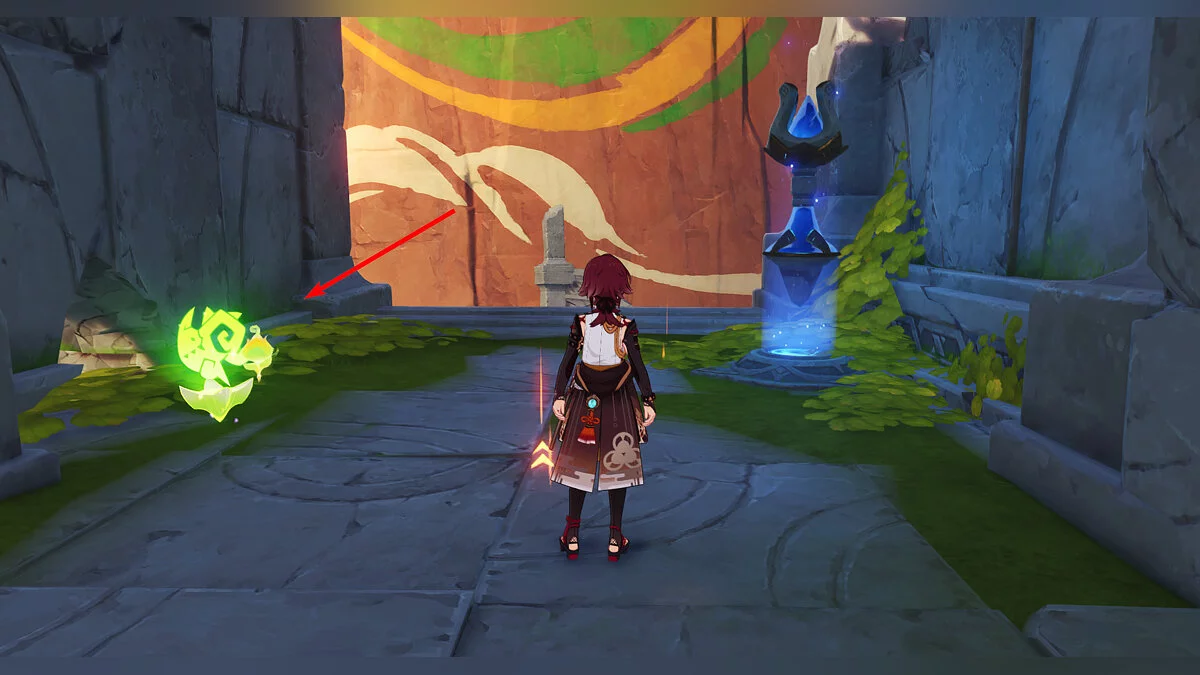 Уничтожив хиличурлов возле печати на камне, вселитесь в возникший монумент с тепетлизавром и разбейте символ. Из него выскочит маниту. Сопроводите создание до рисунка и попутно расправьтесь с ещё одной группой хиличурлов.