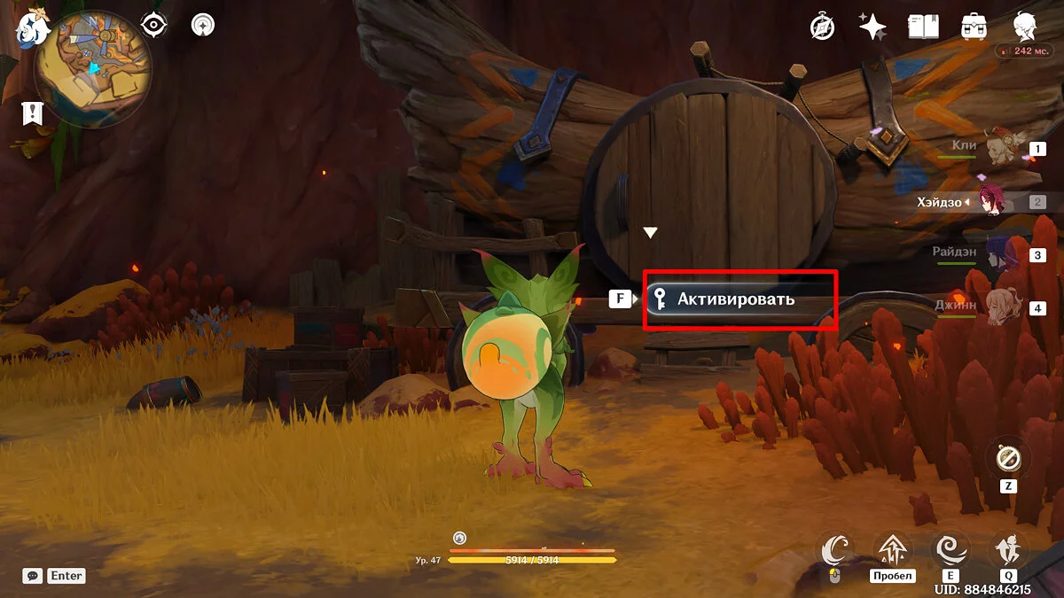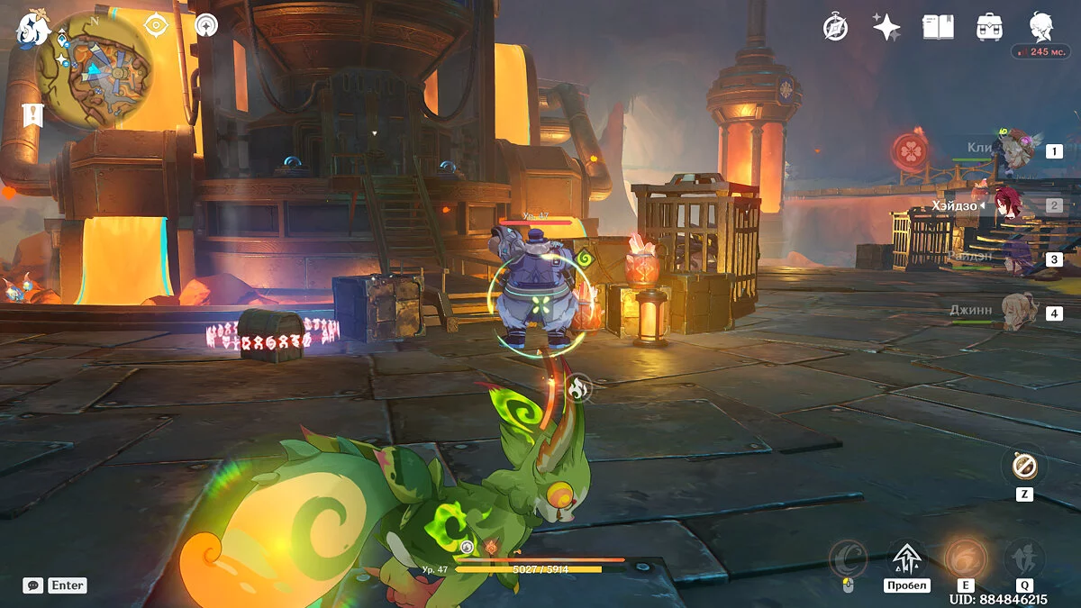 Вы попадёте в сердце Центра по исследованию флогистона. Посередине будет стоять большая труба, а возле неё снуют Фатуи. Расправиться с врагами помогут взрывающиеся бочки и пламегранаты. Будучи в теле юмказавра, возьмите их навыком и выпустите во врагов. После чего пройдите чуть вперёд, поднимитесь по лестнице и таким же способом одолейте ещё Фатуи, а затем заберите богатый сундук. В нём тоже будет ключ, которым можно отпереть телегу неподалёку. Там будет сундук.