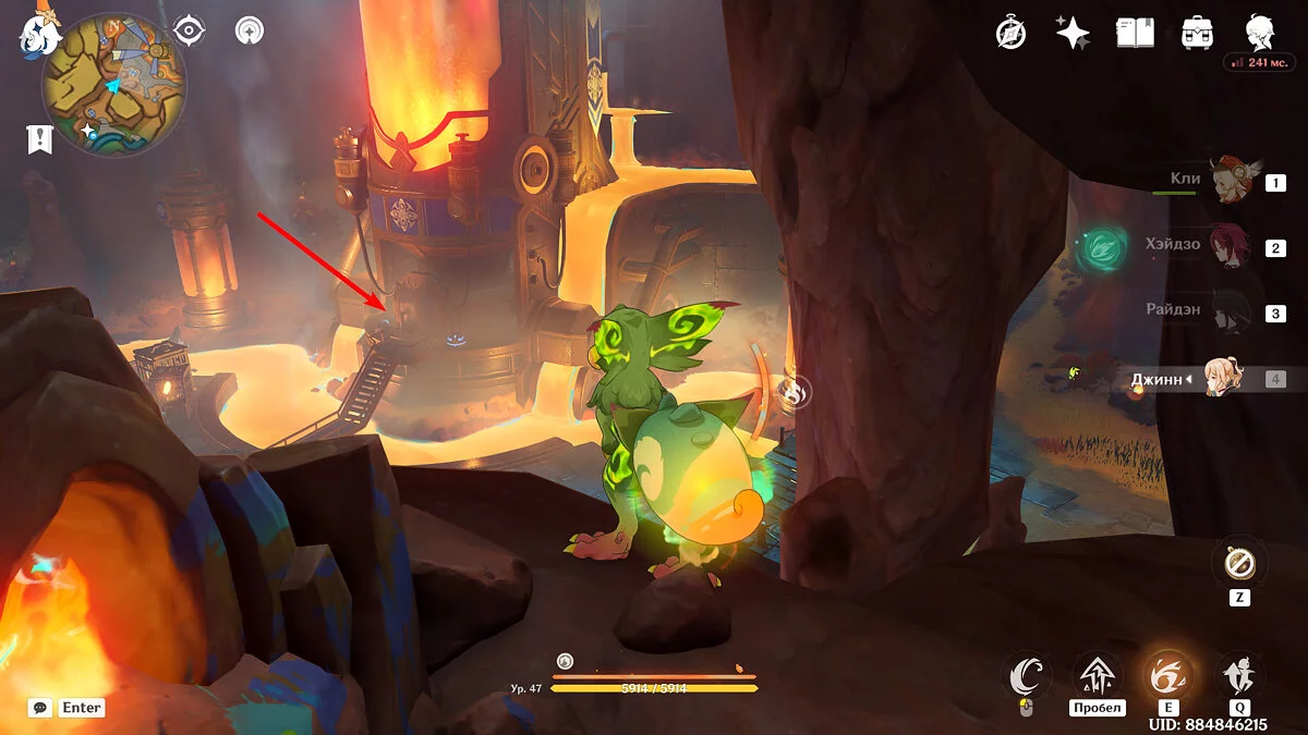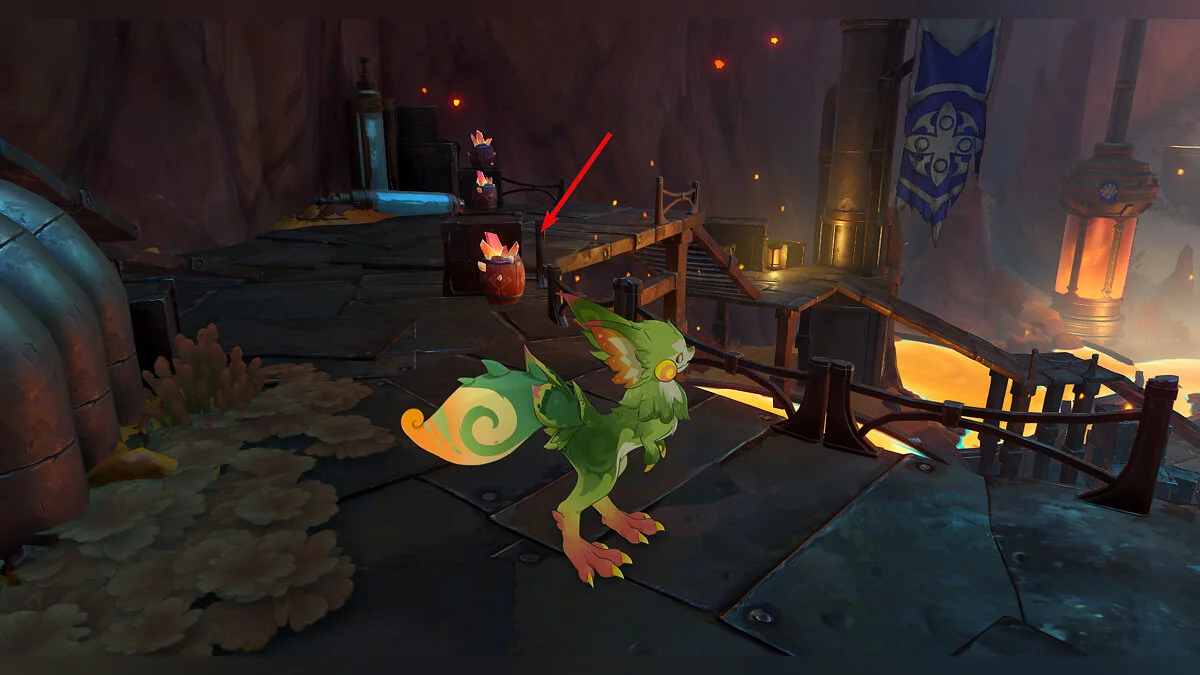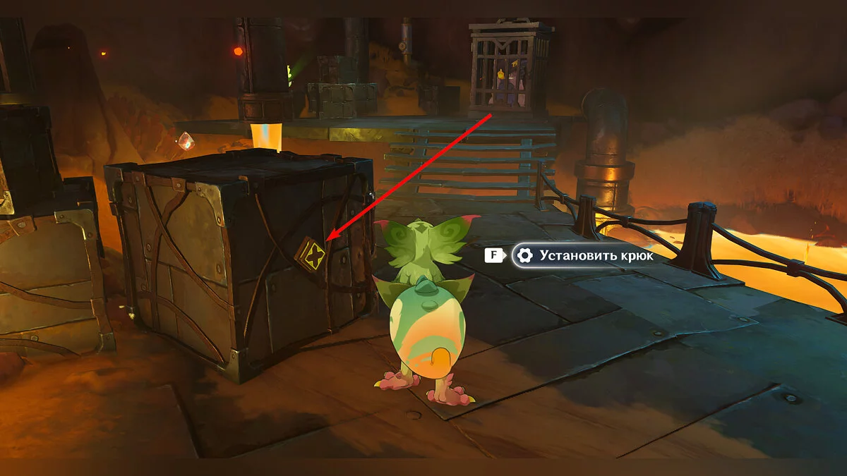 Для этого поверните направо и отыщите тепетлизавра, неустанно ползающего за флогистоновым ручейком. Перейдите к завриану и нажмите «В погоню». Из лавы выскочит детёныш, который выкопает крюк. Возьмите предмет и вернитесь к устройству с сферой. Установите приспособление к ящику и с помощью навыка юмказавра переместите его прямиком к решётке.
