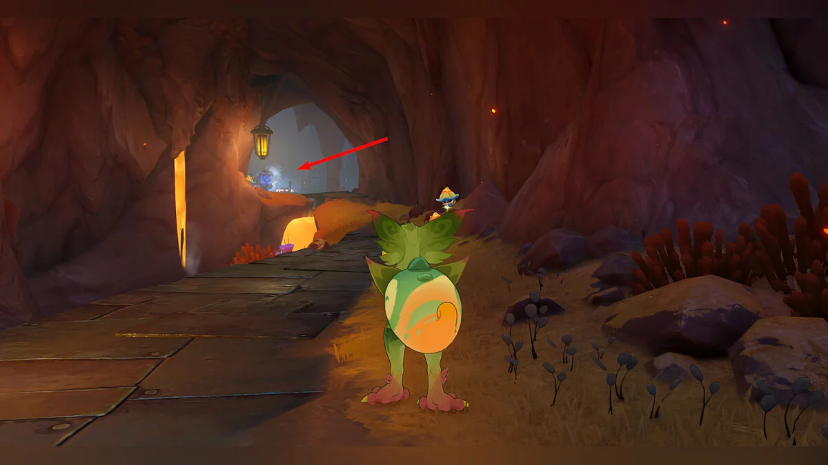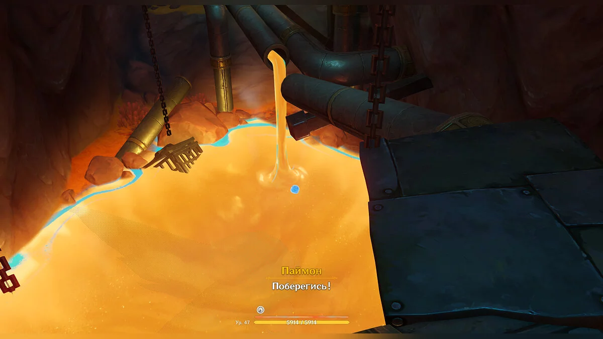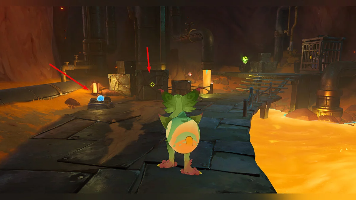 Двигайтесь в сторону жидкого флогистона, перейдите через трубы, пока вас не прервёт Паймон. Заберите из лавы фальшивую сферу передачи — небольшую сферу голубого цвета. Перейдите через трубу и вставьте её в небольшое устройство, тёмно голубого цвета. После этого решётка впереди откроется, позволяя войти внутрь.