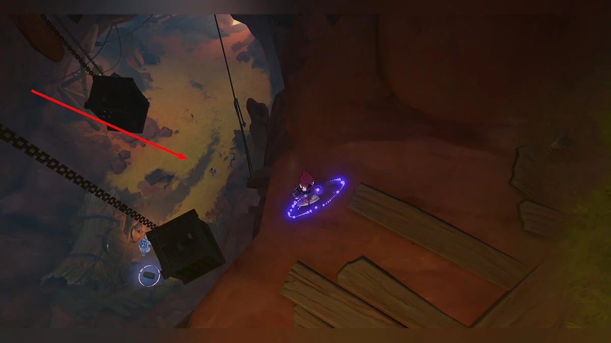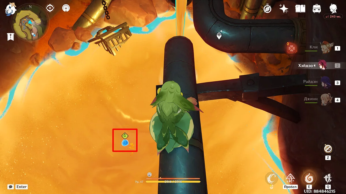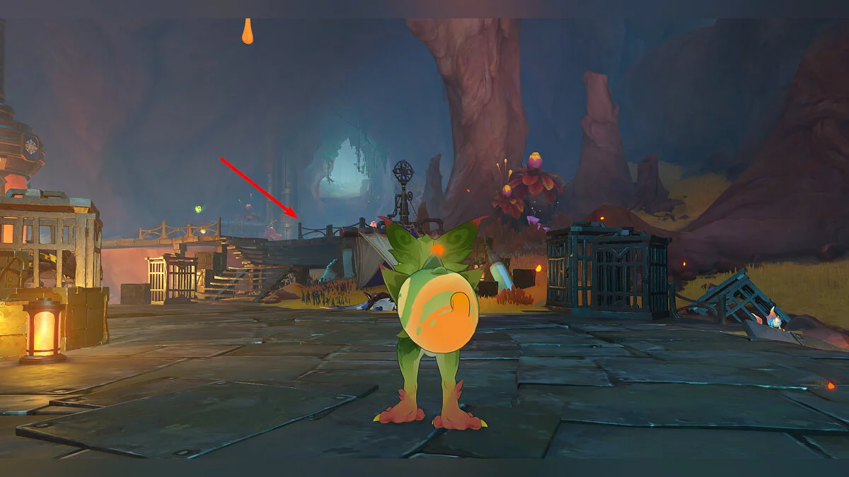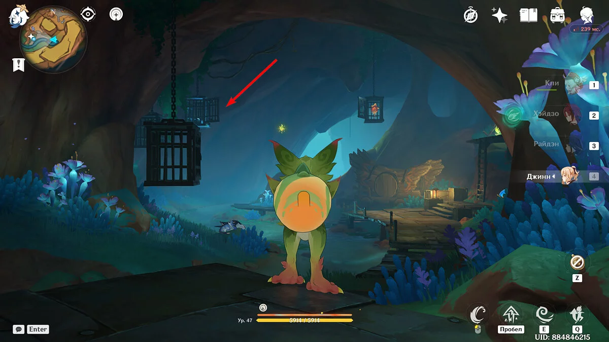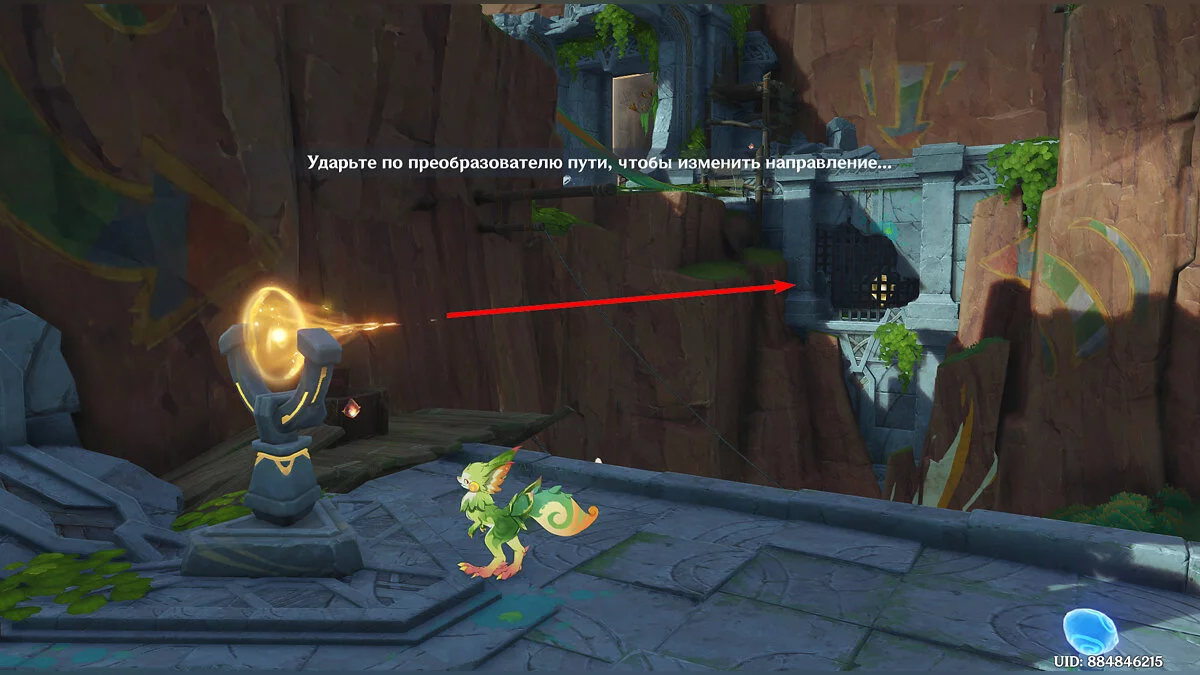 Когда ящик окажется на месте, можете смело забирать фальшивую сферу и идти к большой трубе. Поместите шар в устройство и одолейте возникших Фатуи. После этого вернитесь к телеге и бегите в другую часть пещеры. Сфера находится в одной из клеток, что подвешена к потолку.