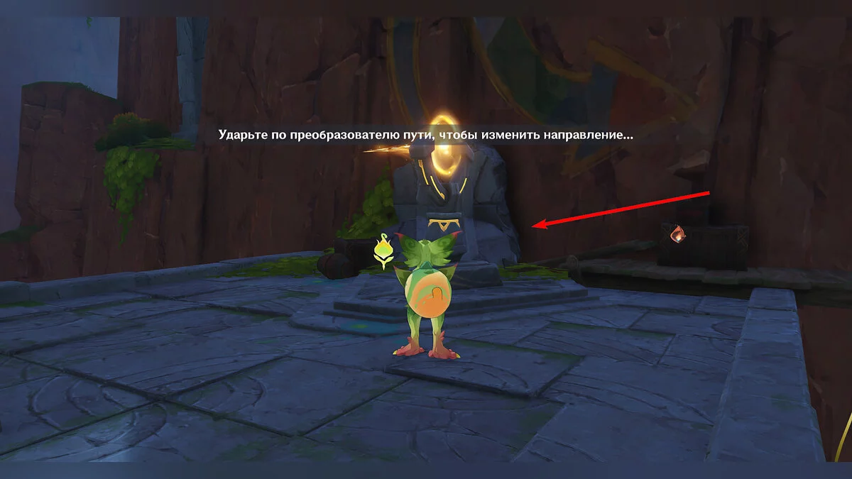 Первая часть головоломки будет справа от телепорта. Пройдите вперёд по деревянному мосту и увидите внизу механизмы. Спуститесь туда и проделайте следующие действия: потяните за крюк справа, возьмите сферу и пустите её в открывшийся портал (на скриншоте эти предметы помечены цифрами). Преобразователь отправит шар в открывшийся портал. Если проход начал закрываться — потяните за крюк ещё раз. Если всё сделано успешно — появится богатый сундук с каменной статуей внутри. Чтобы открыть проход в Храм Предков, понадобится ещё две фигурки.